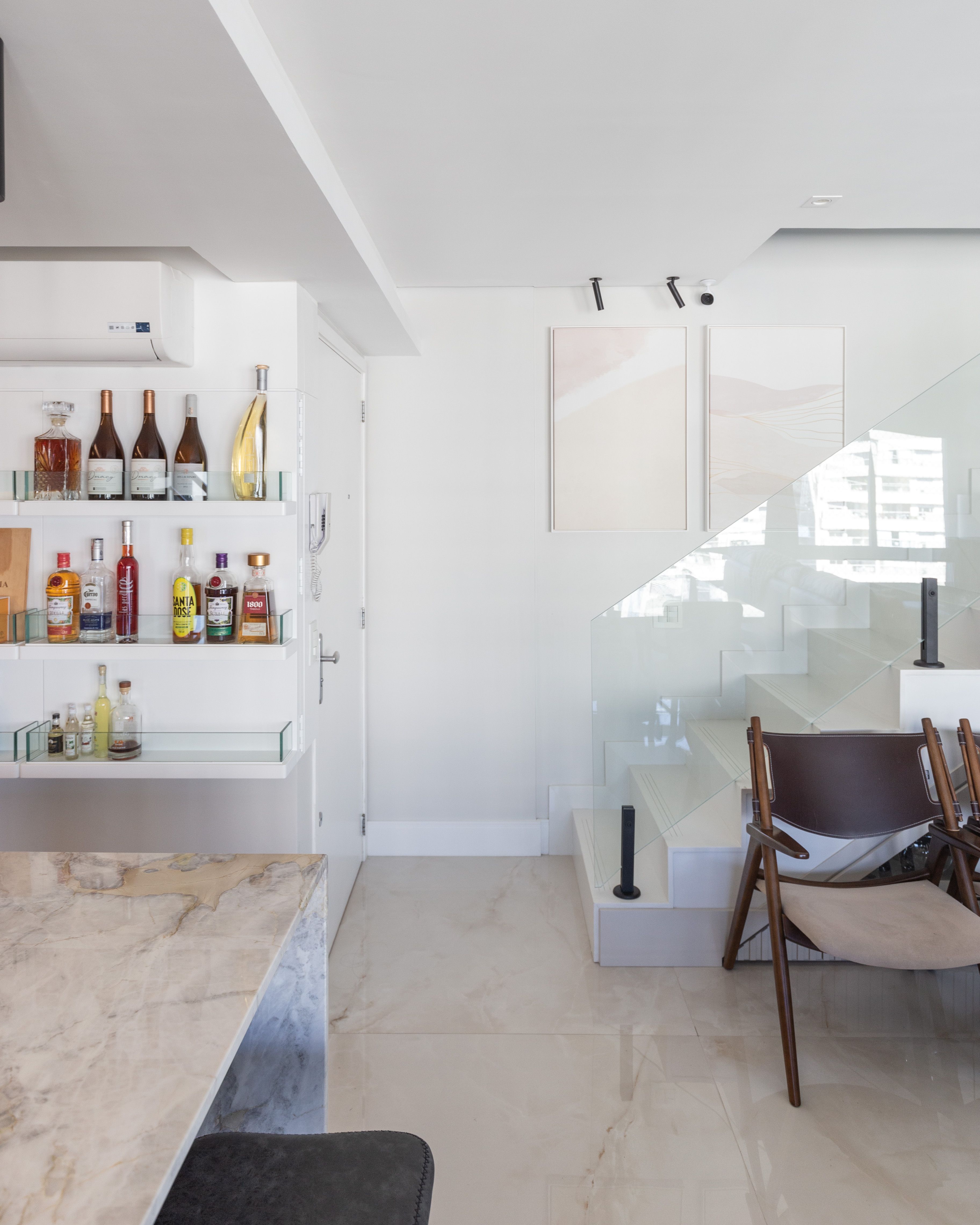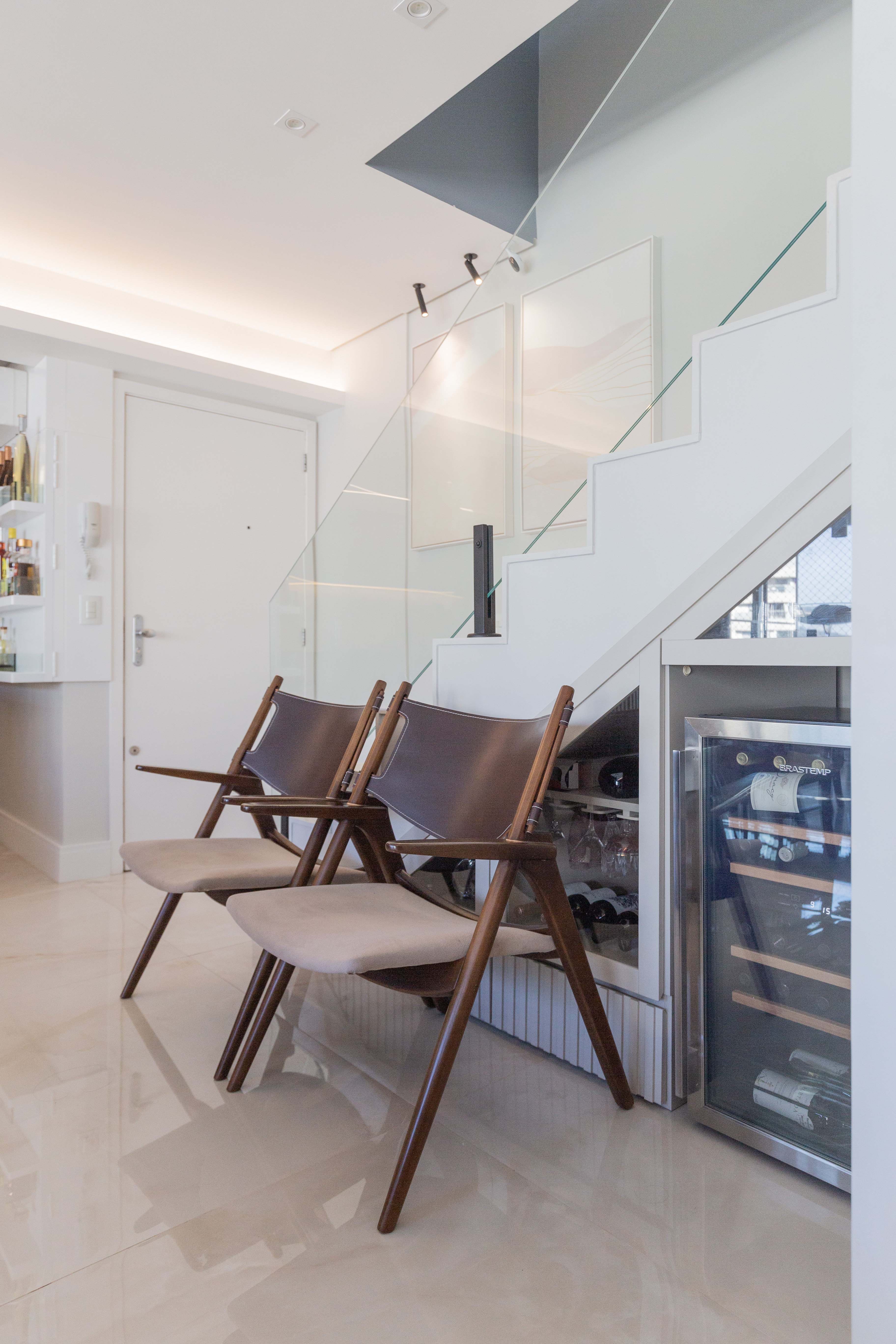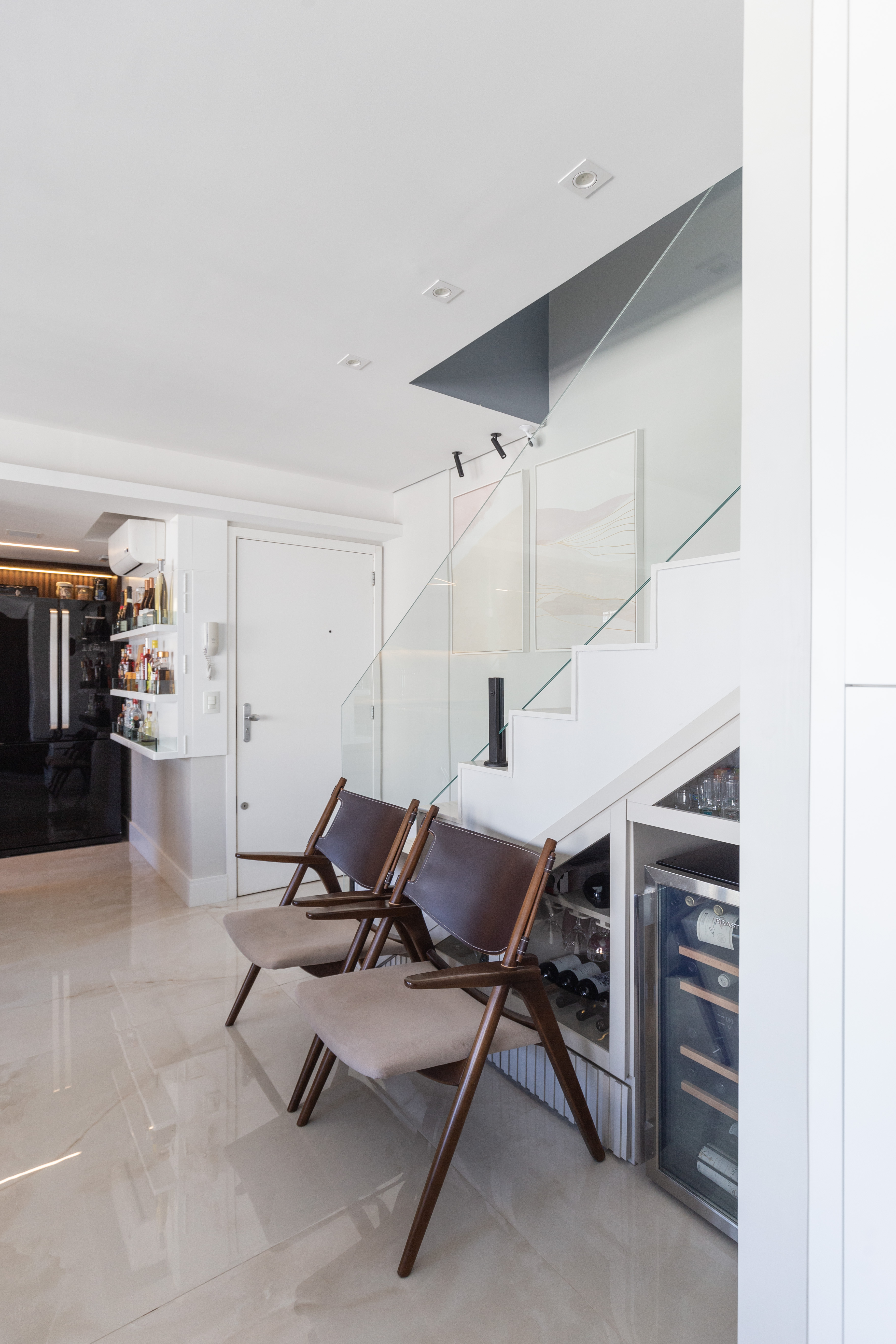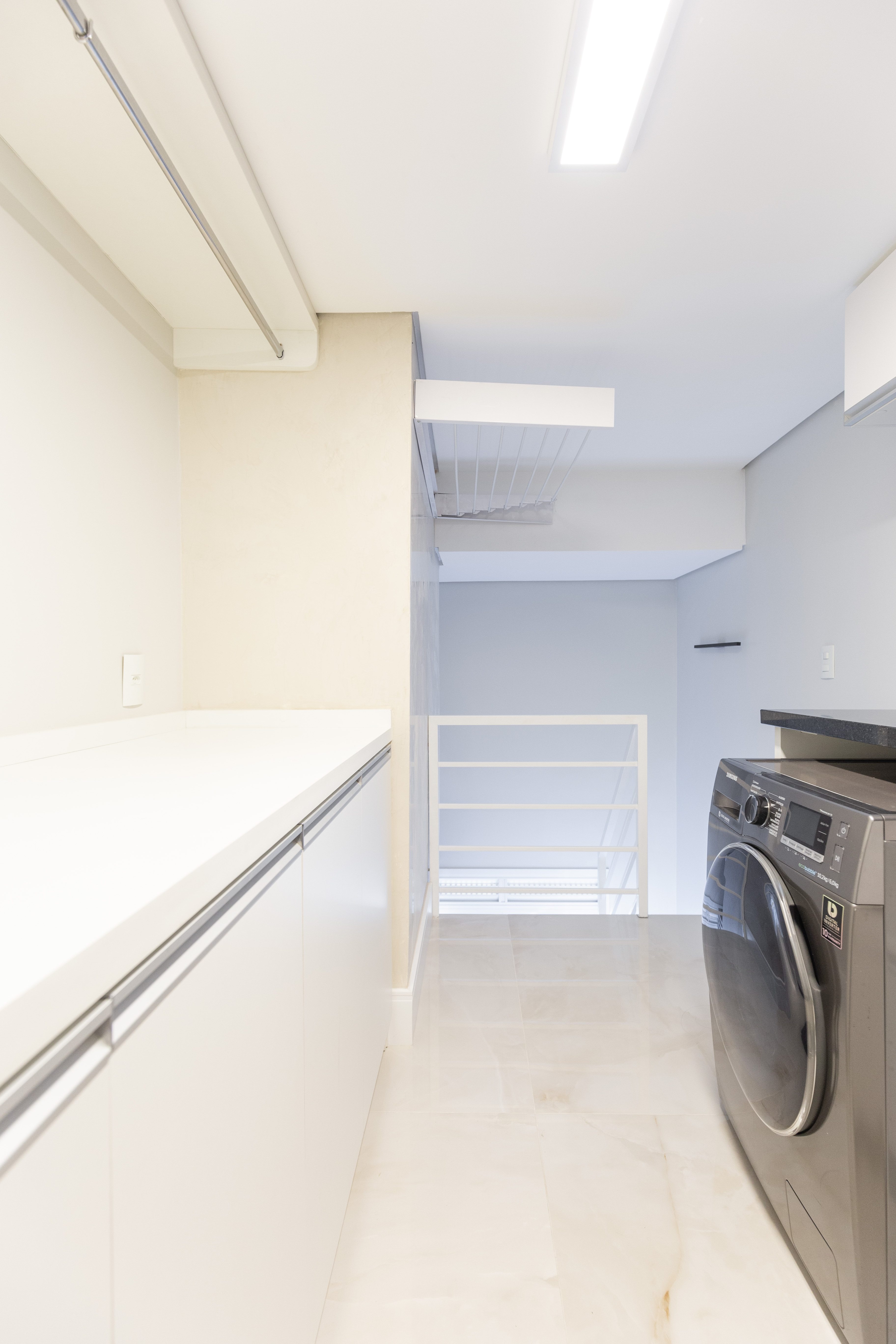 Projeto de interiores residencial em que foi feita uma grande intervenção em um pé direito que estava sem uso dentro do apartamento. Nessa altura que estava “sobrando”, foi projetado um mezanino onde ficou localizada a área de serviço, criando assim na parte baixo do apartamento uma cozinha mais ampla e mais integrada com o restante do apartamento.