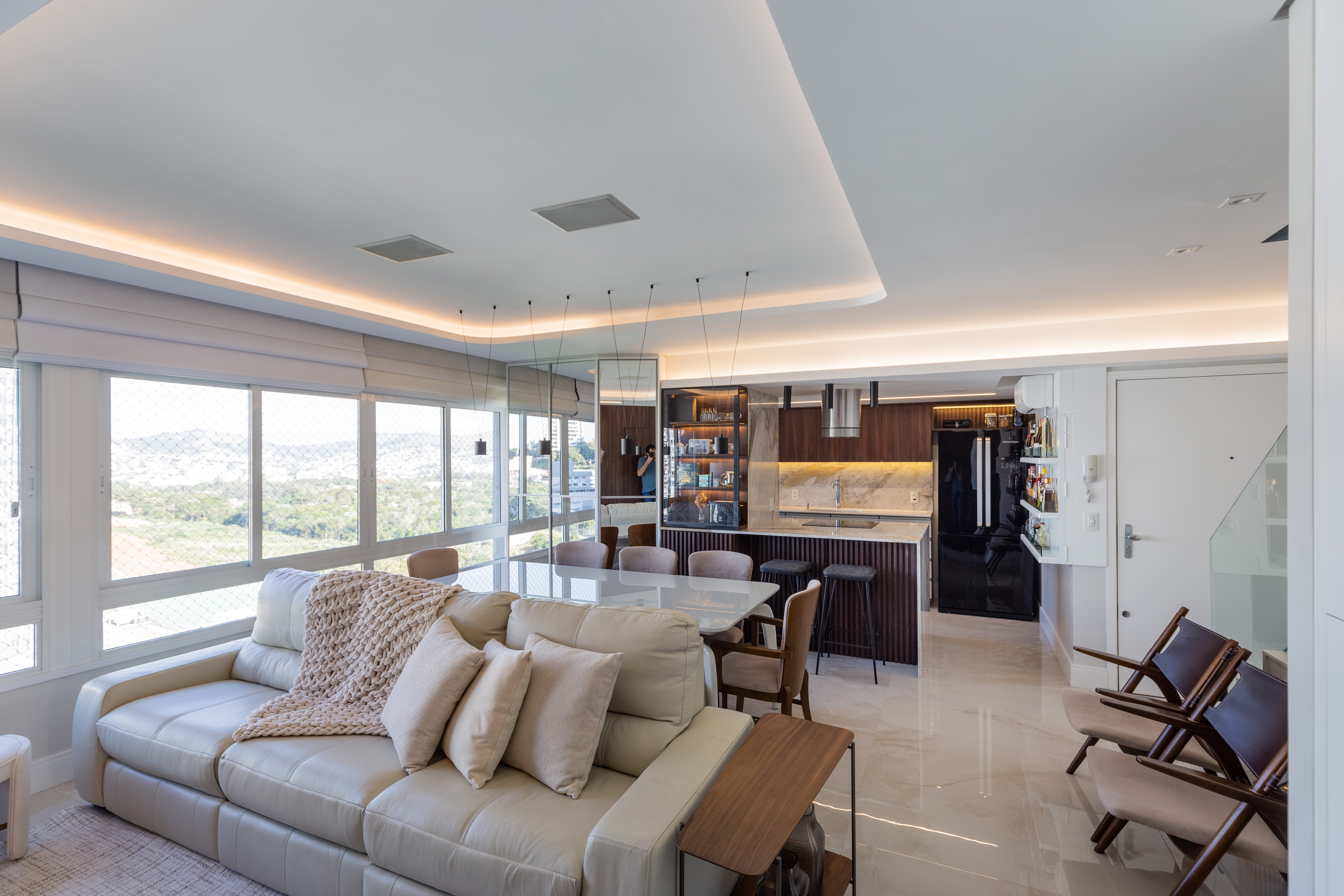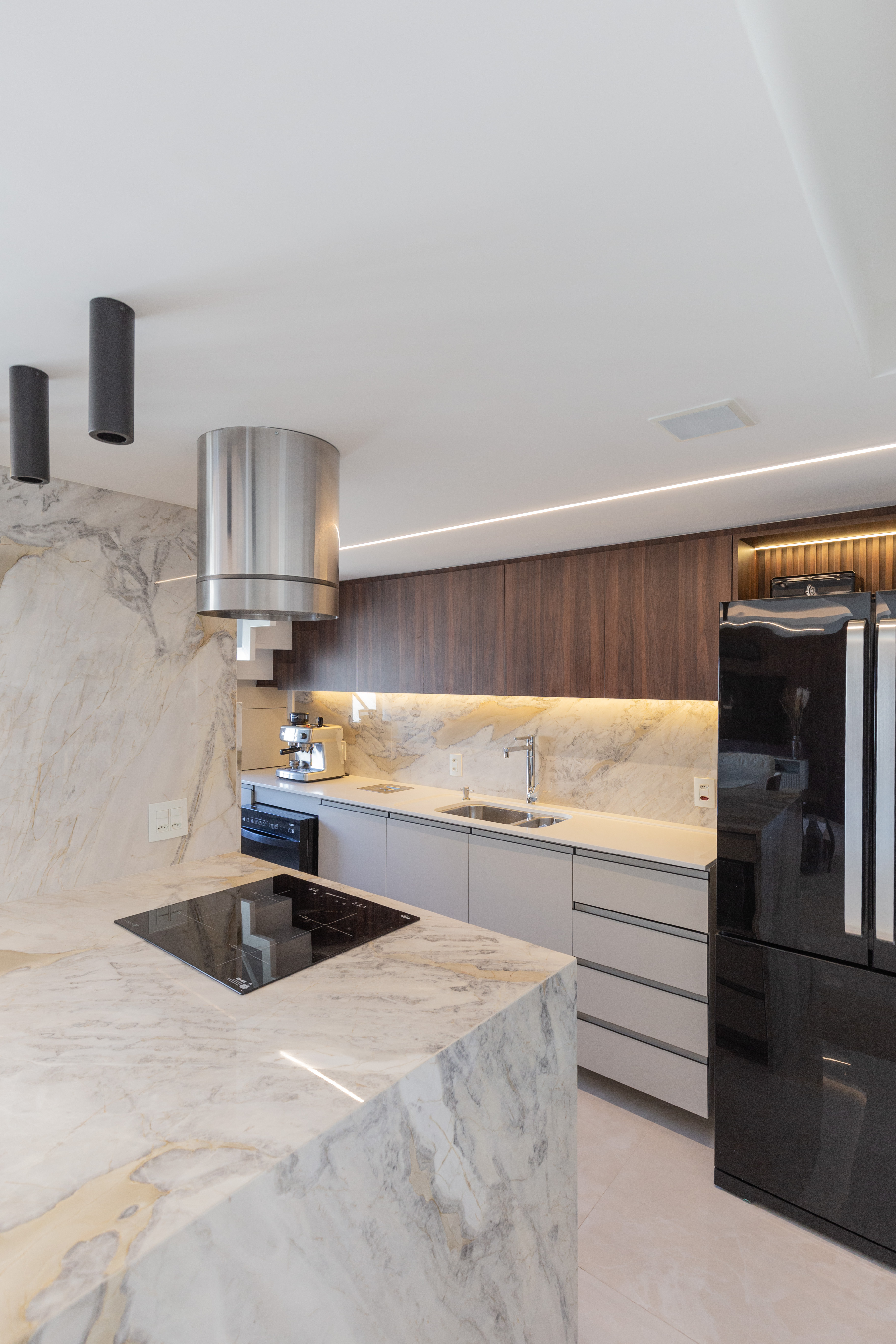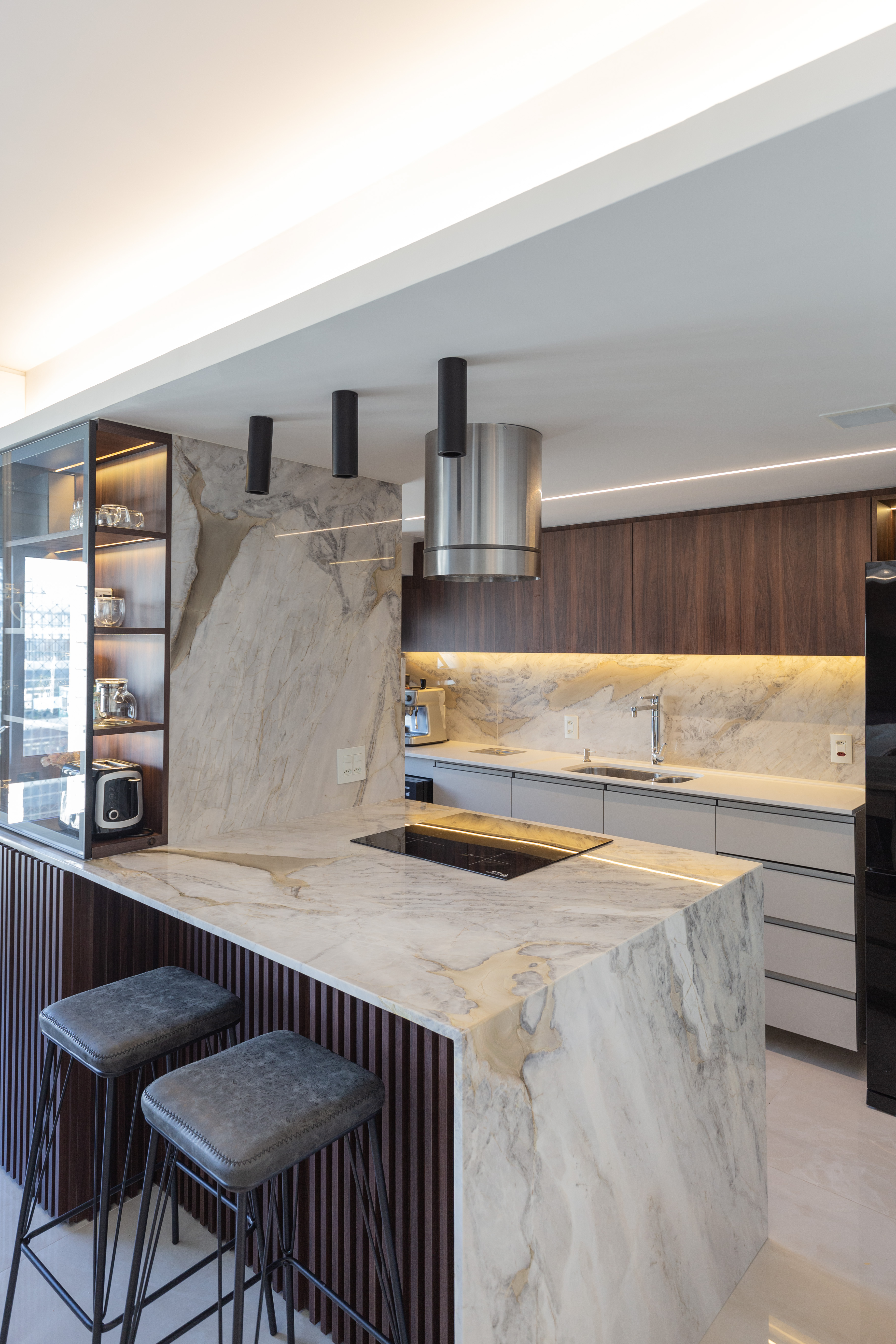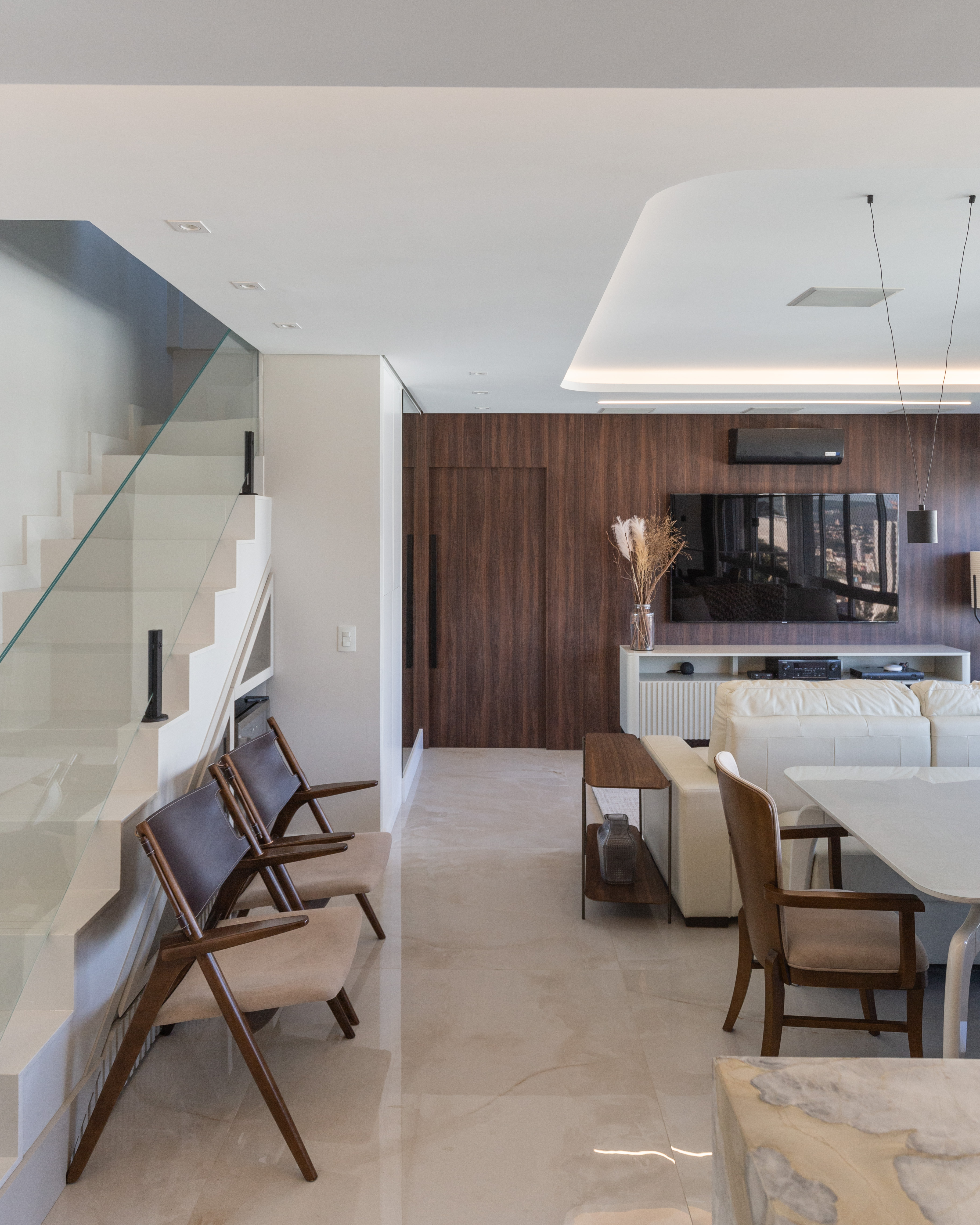 Projeto de interiores residencial em que foi feita uma grande intervenção em um pé direito que estava sem uso dentro do apartamento. Nessa altura que estava “sobrando”, foi projetado um mezanino onde ficou localizada a área de serviço, criando assim na parte baixo do apartamento uma cozinha mais ampla e mais integrada com o restante do apartamento.