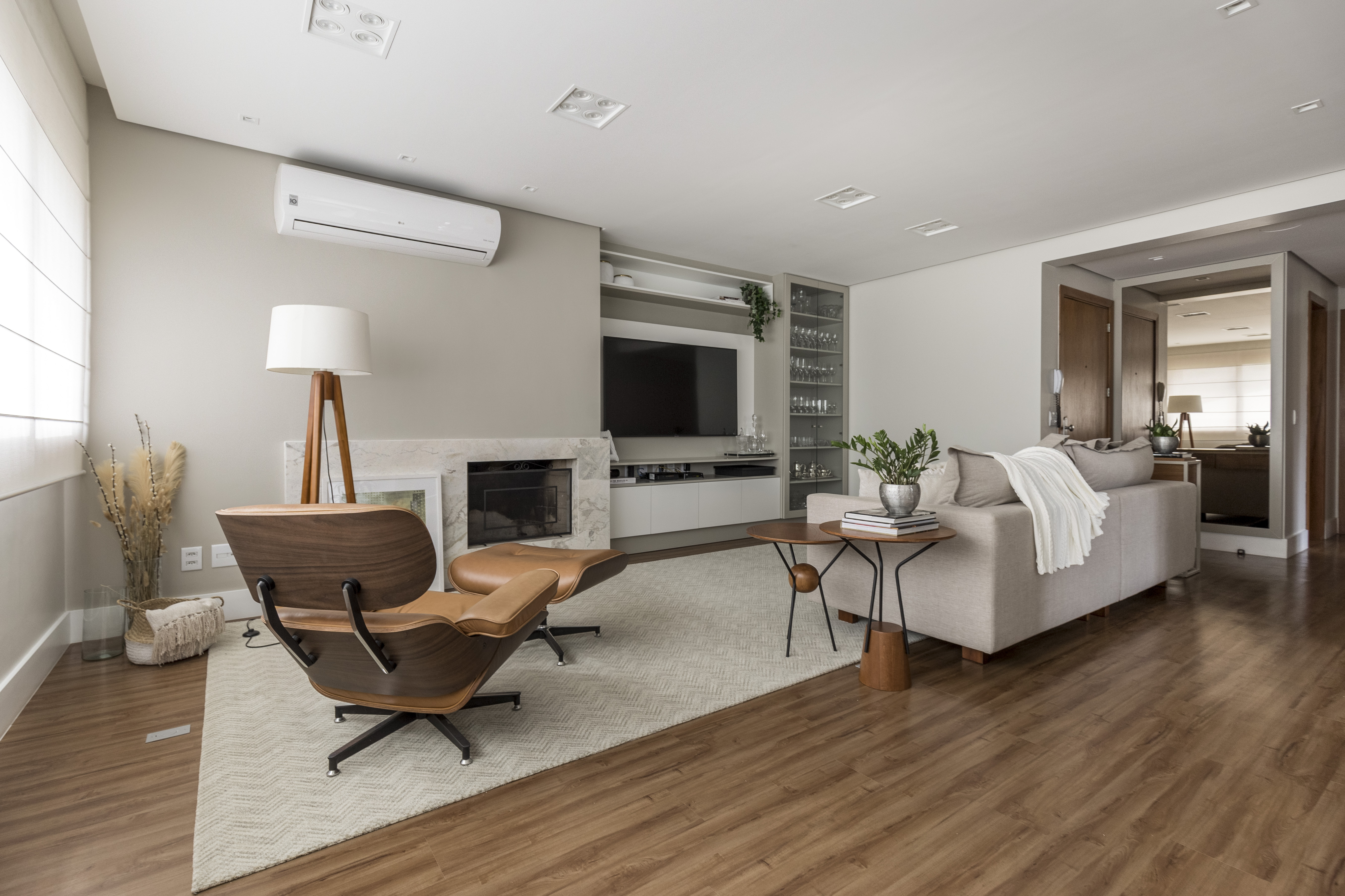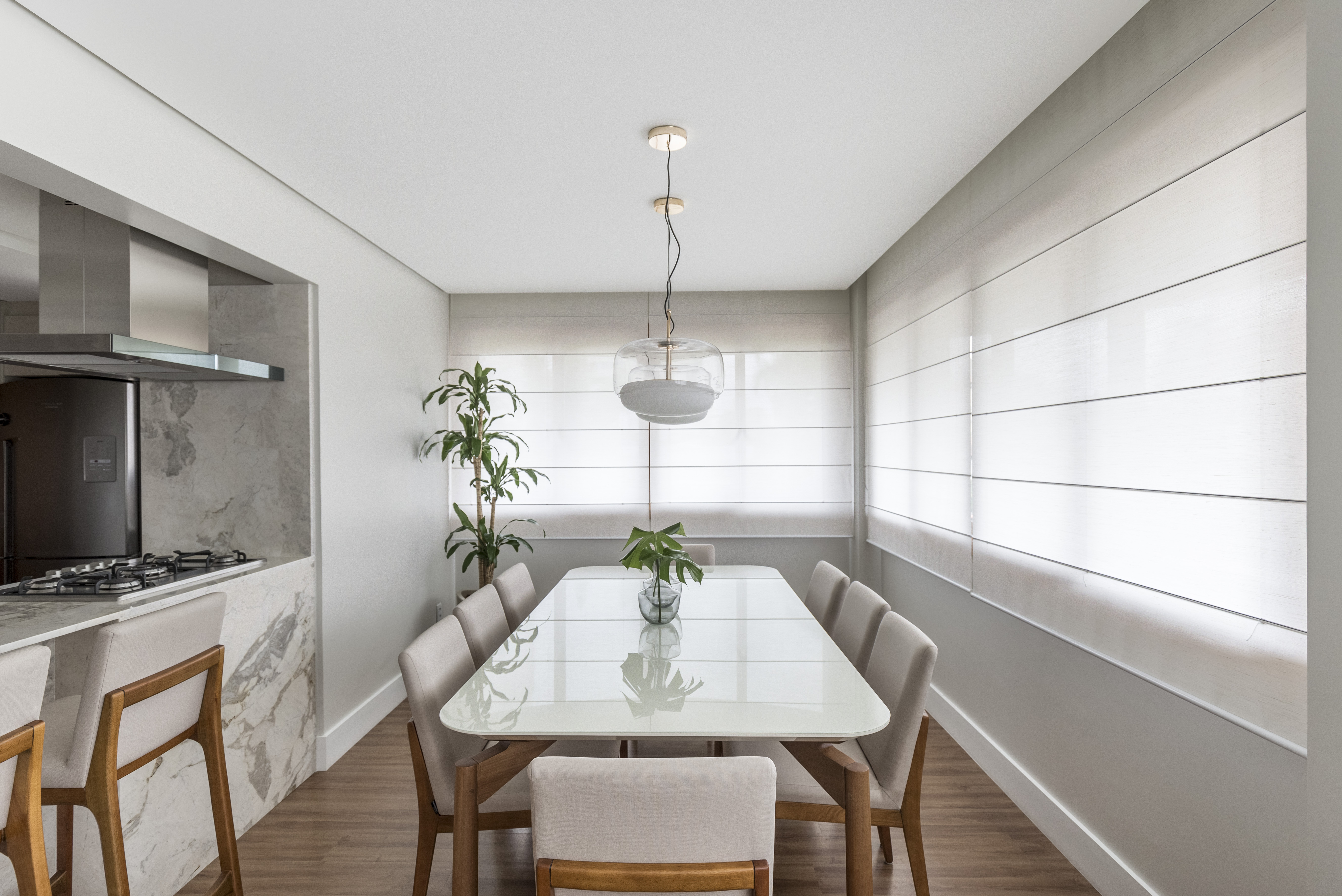 Na sala de estar, jantar e cozinha foram utilizados tons neutros. No piso foi instalado um vinílico amadeirado e no restante foi usado o branco que mescla o bege e fendi.