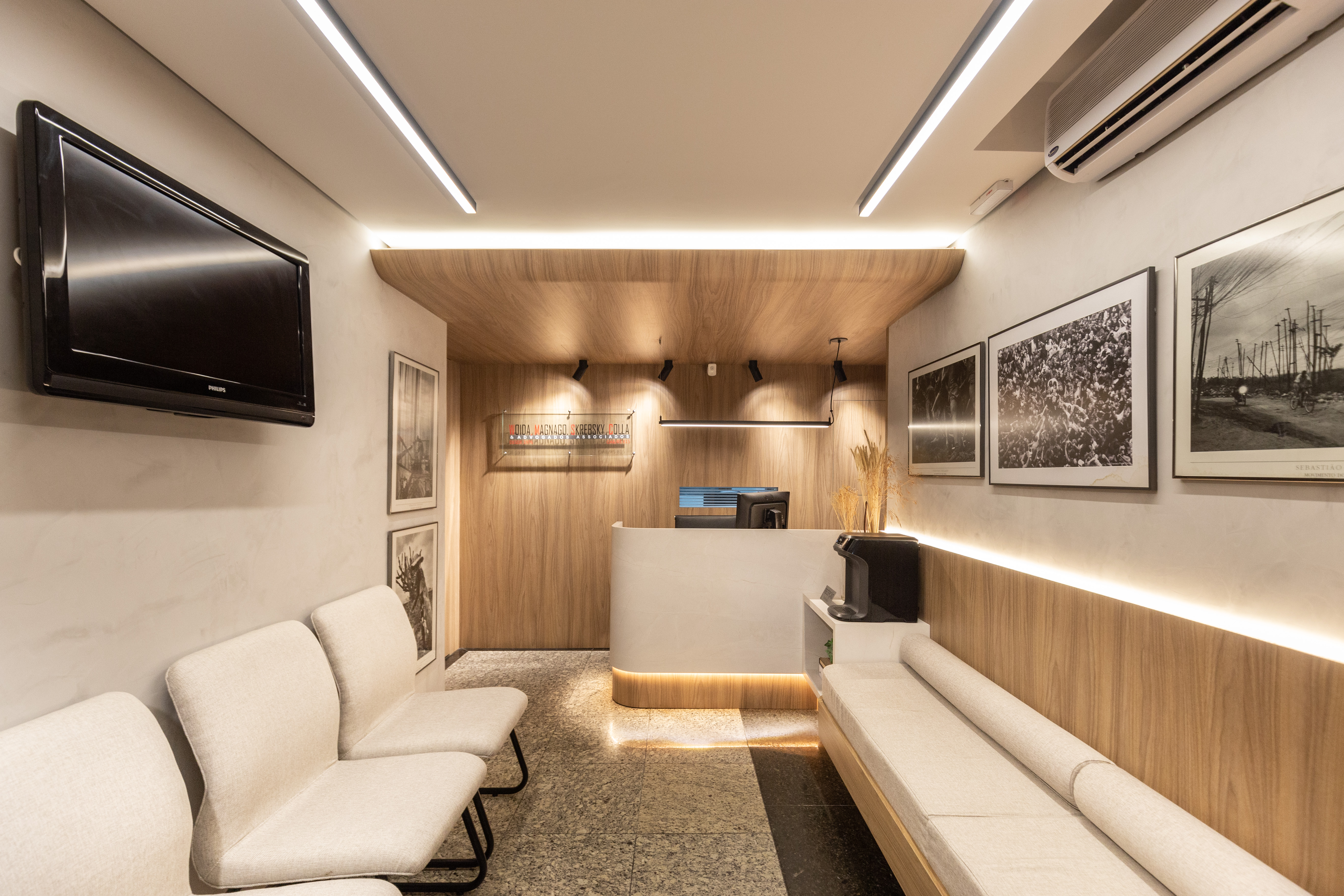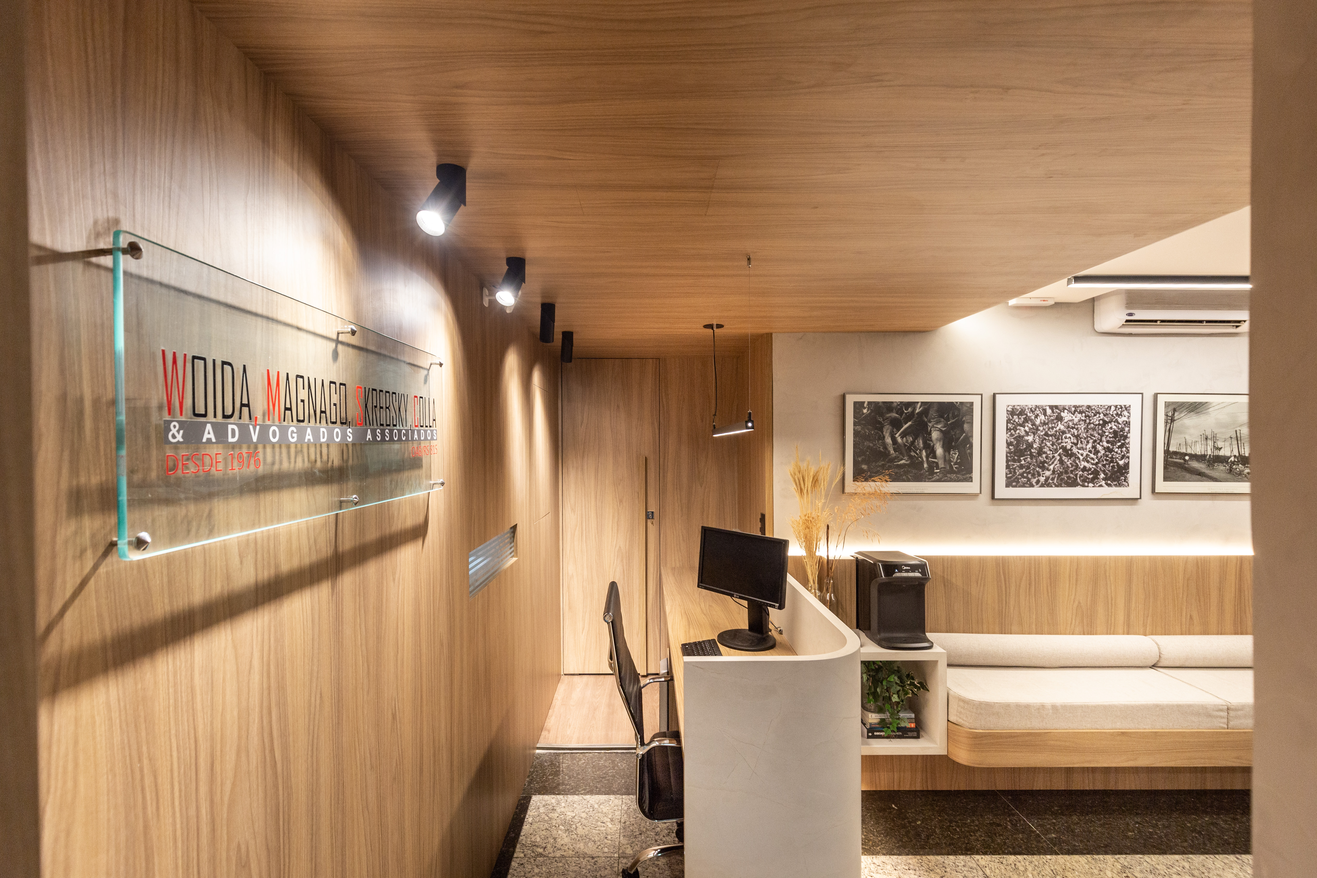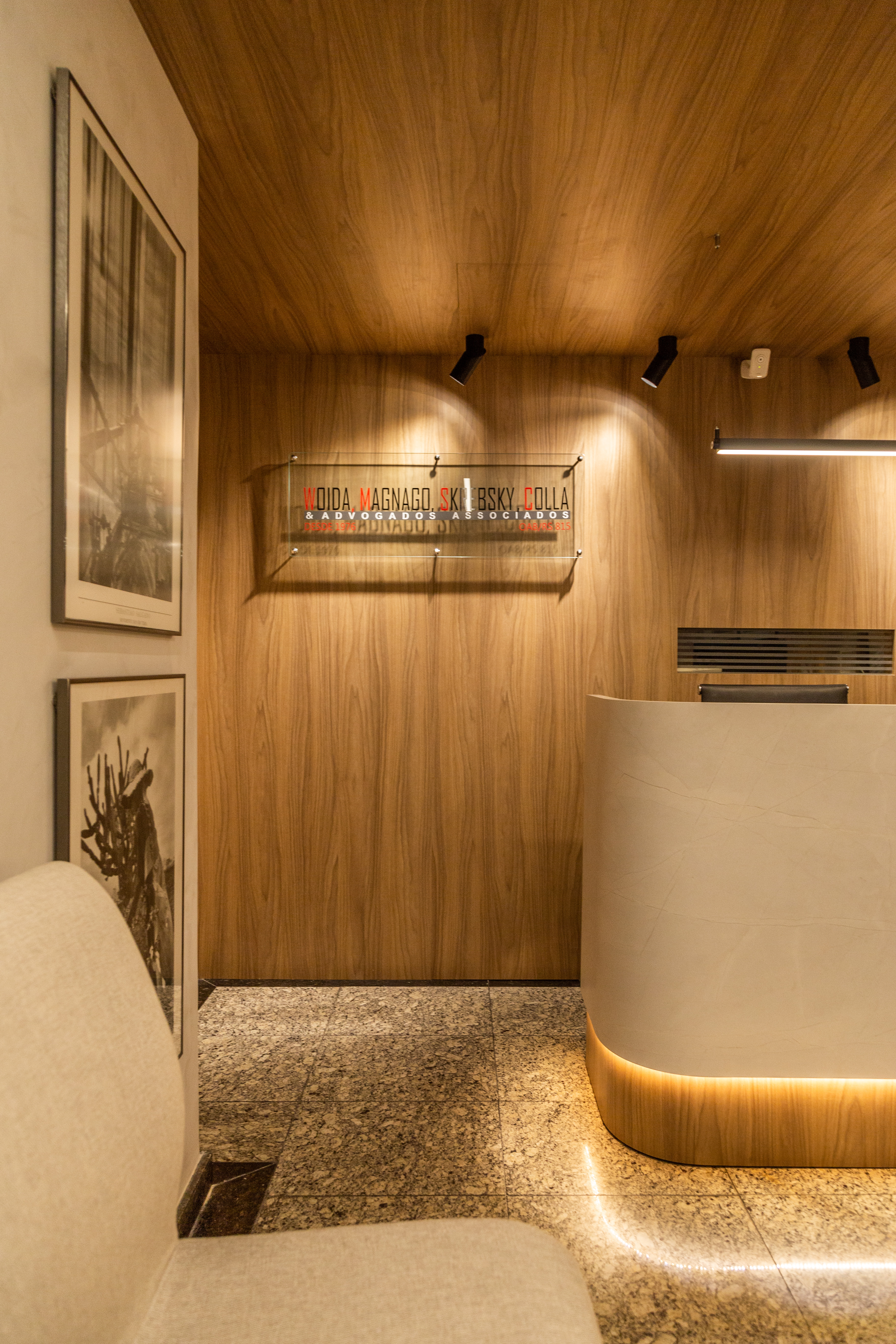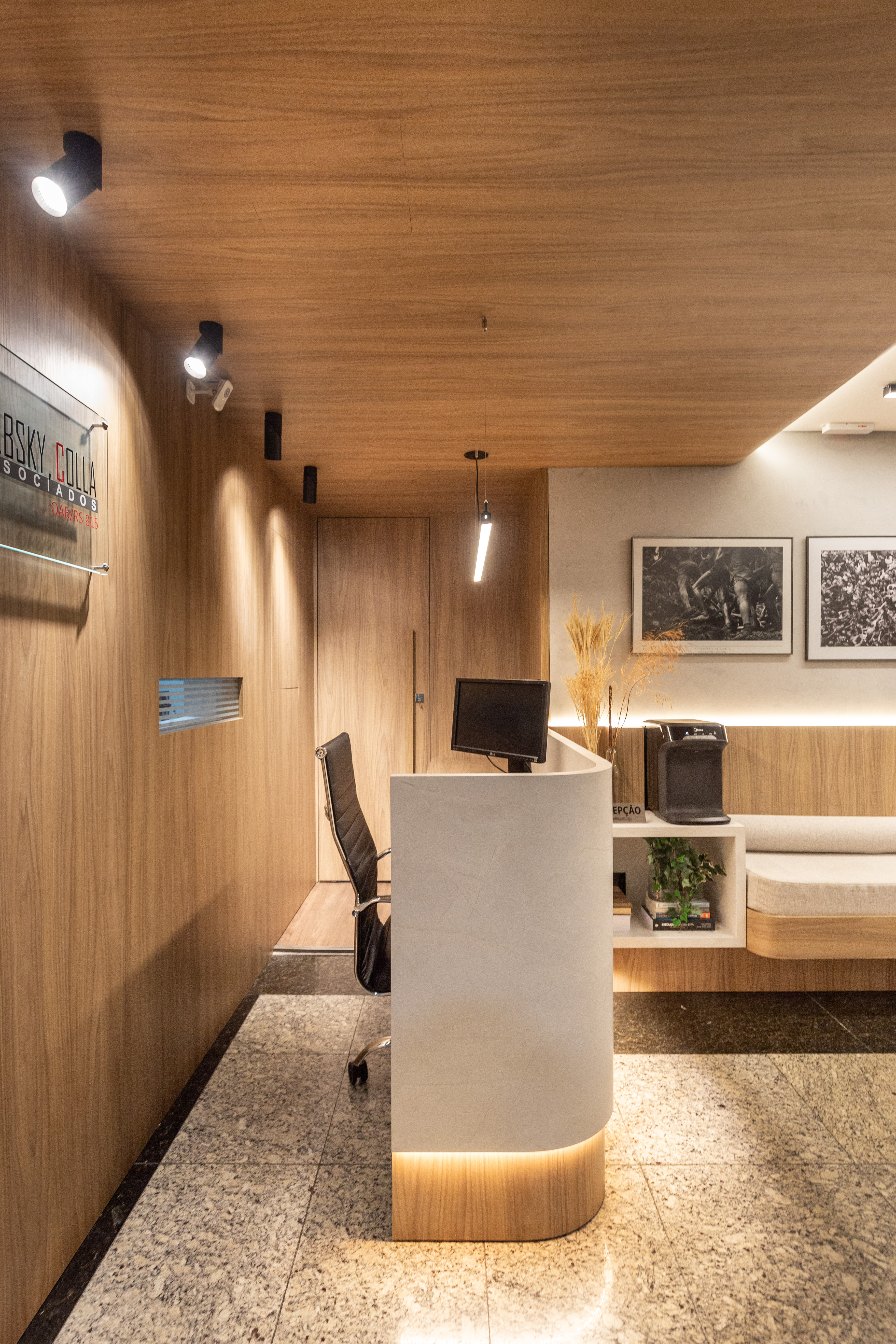 Recepção de escritório de advocacia com painéis amadeirados, estofados em linho, e diversas possibilidades de iluminação que trazem aconchego ao espaço. Formas curvas dão charme e leveza ao ambiente.