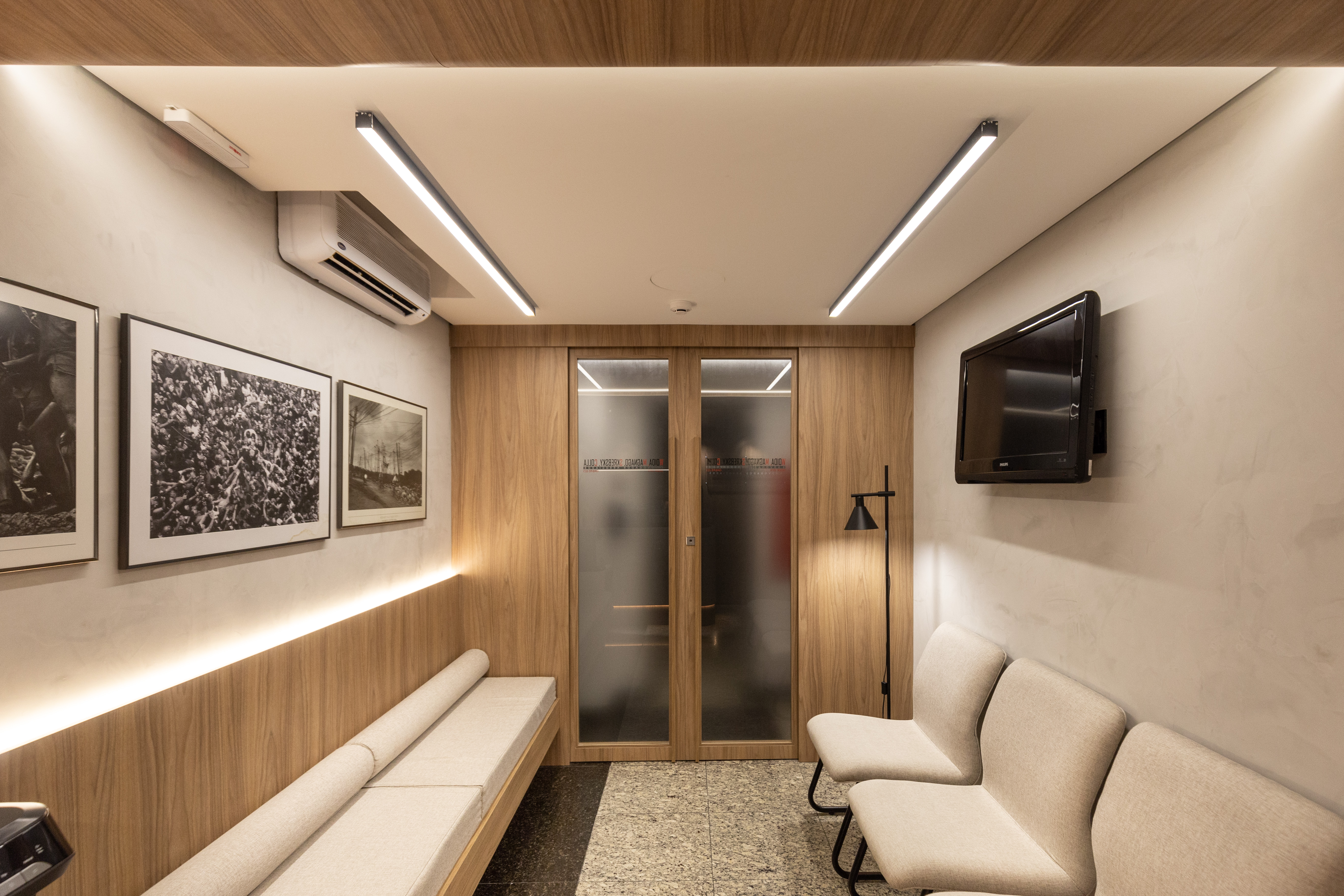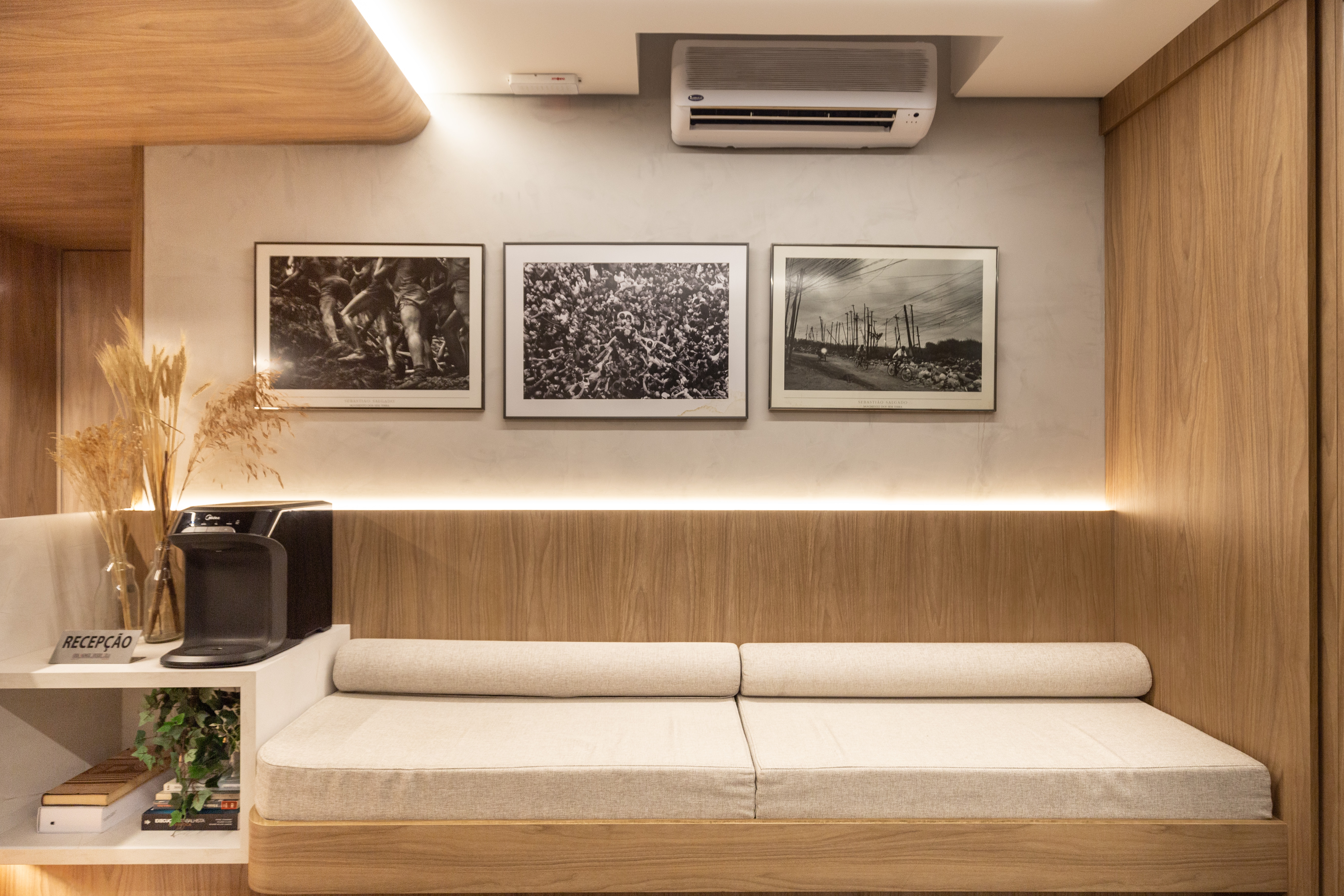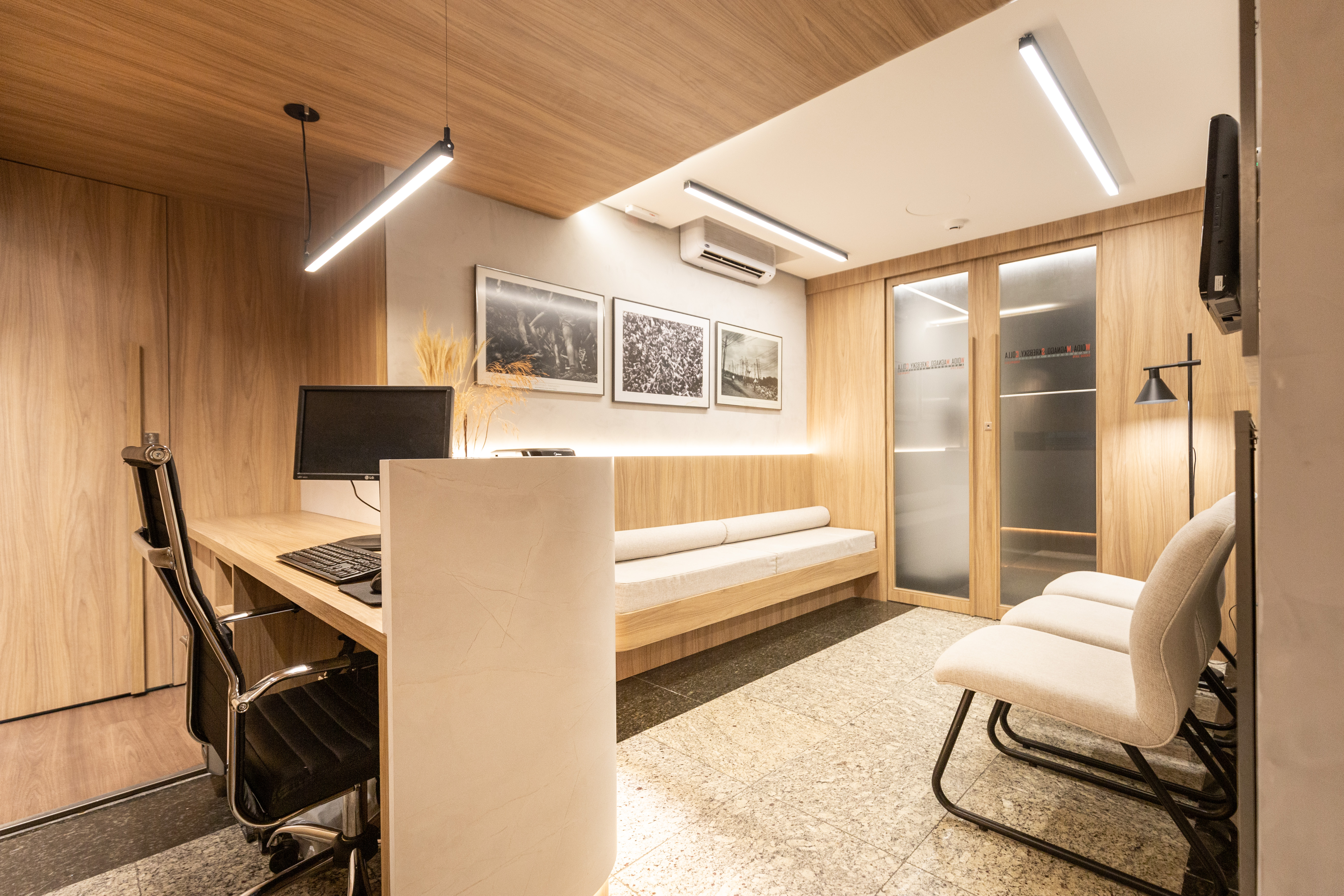 Recepção de escritório de advocacia com painéis amadeirados, estofados em linho, e diversas possibilidades de iluminação que trazem aconchego ao espaço. Formas curvas dão charme e leveza ao ambiente.