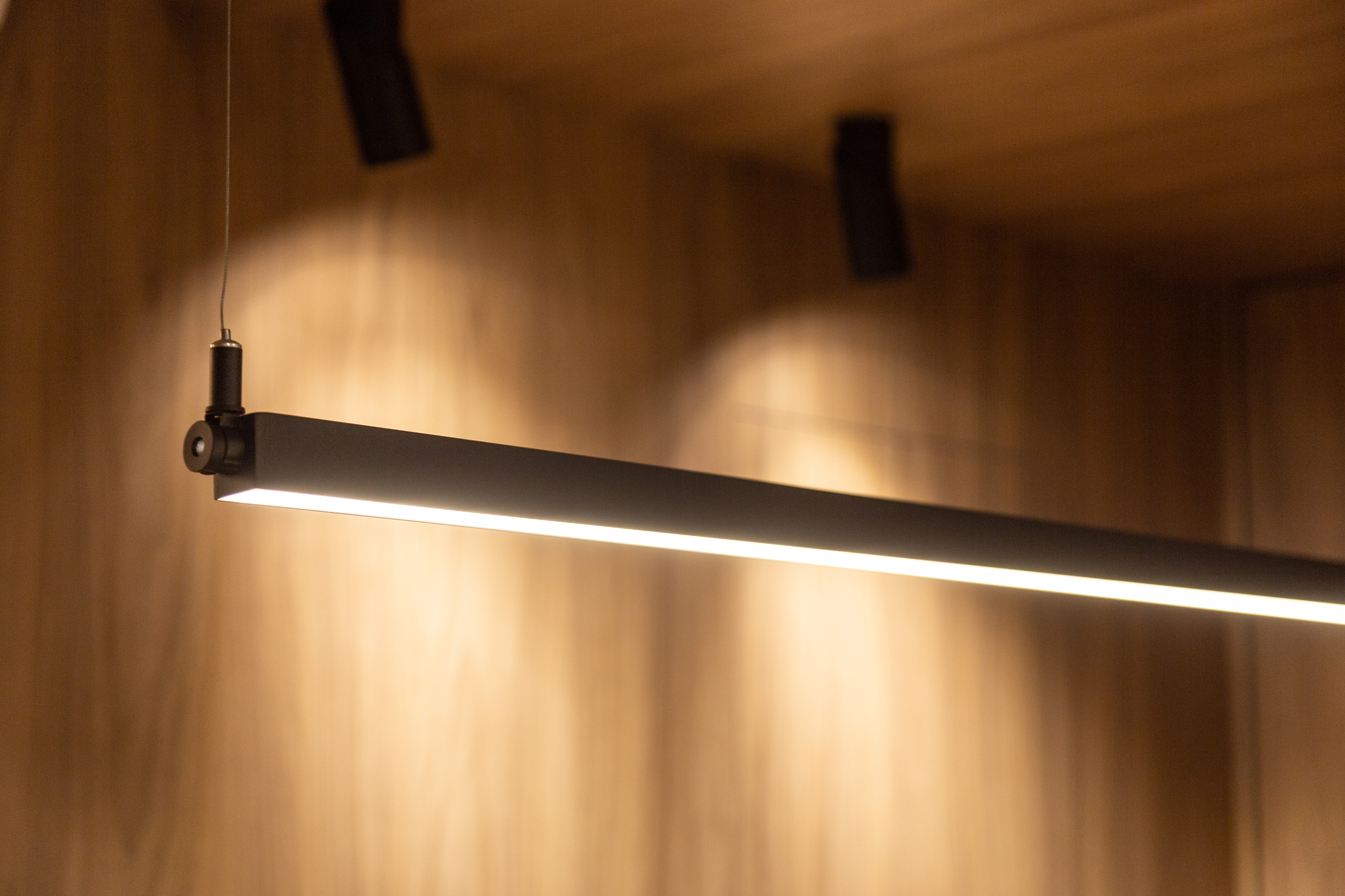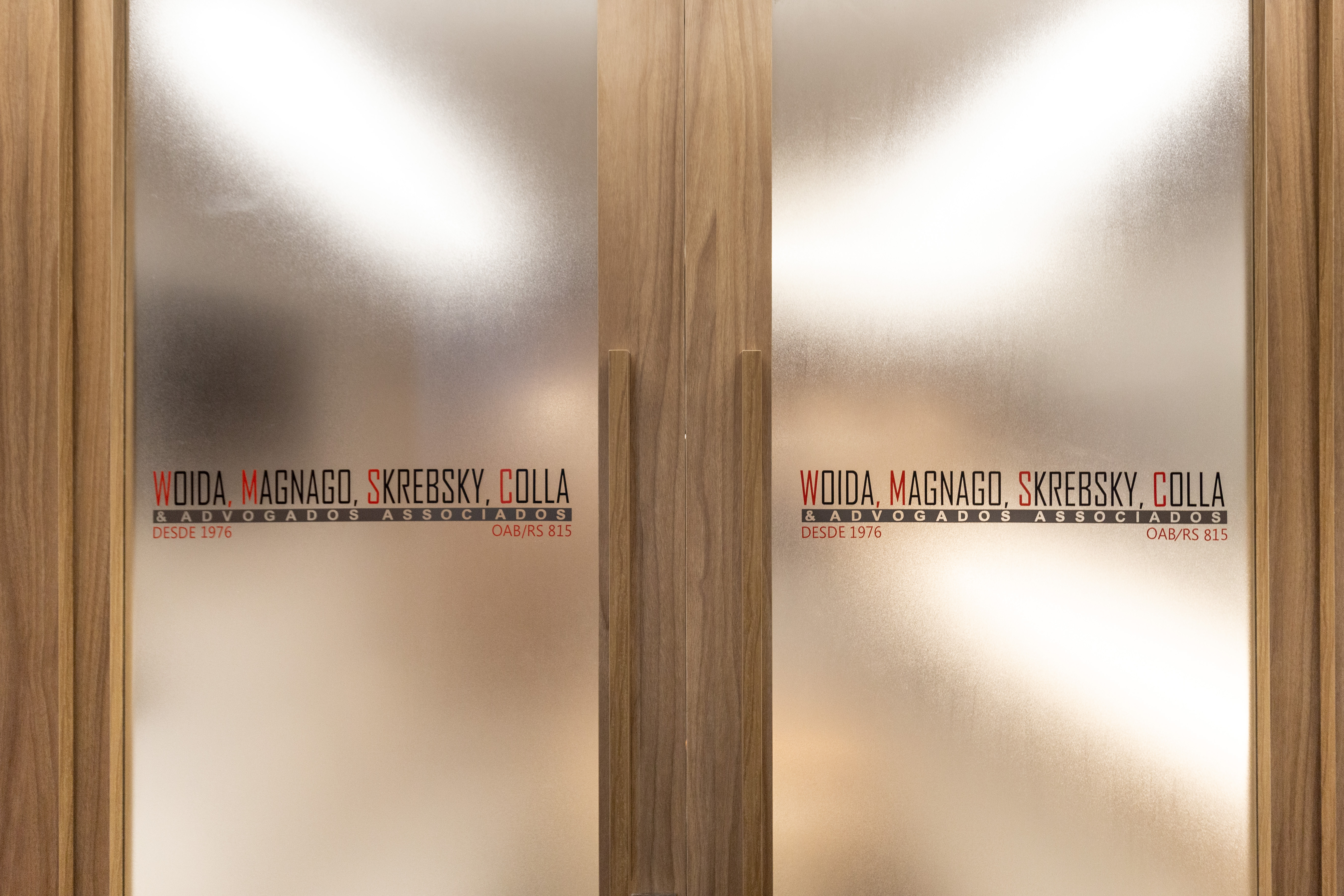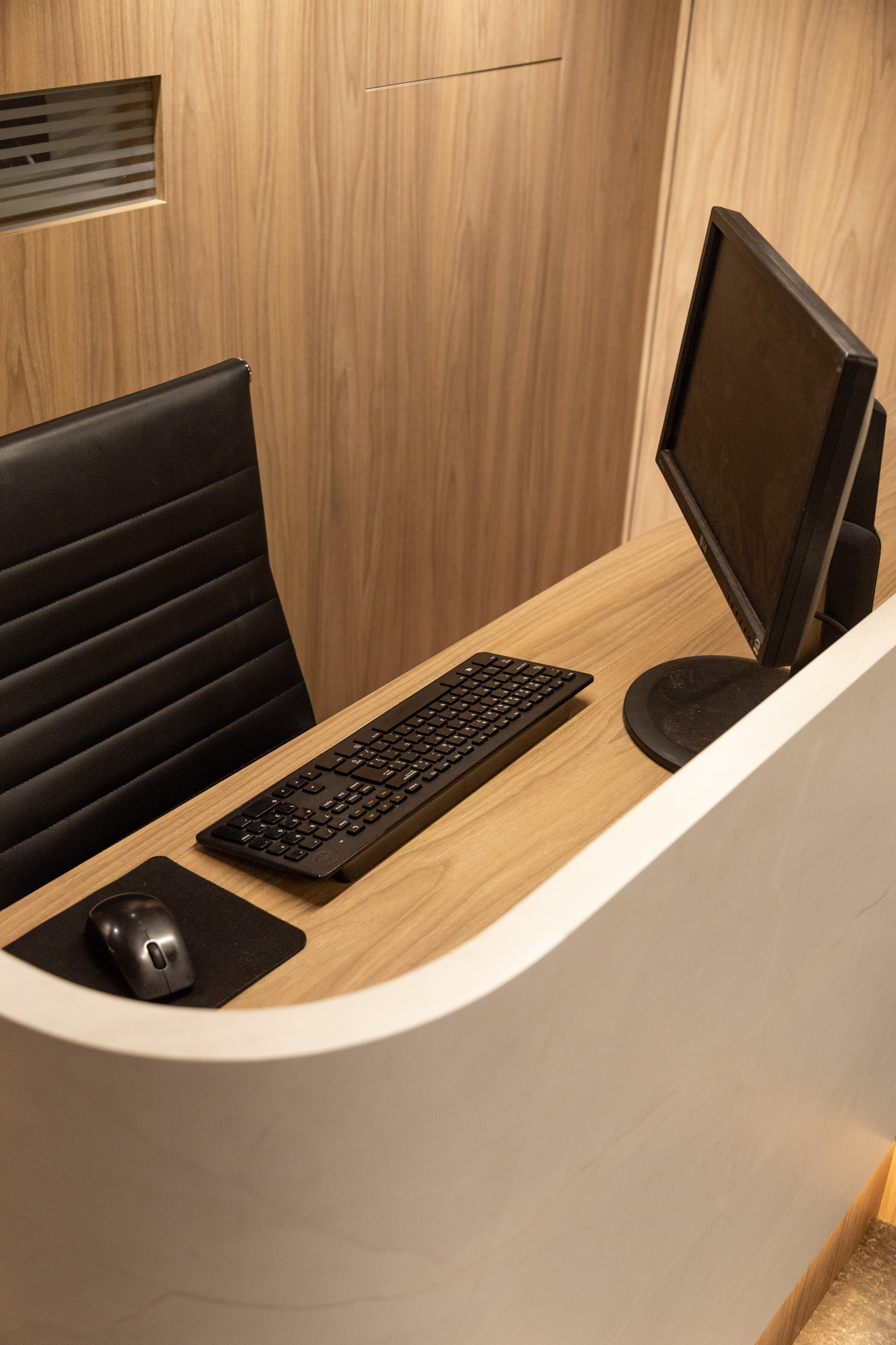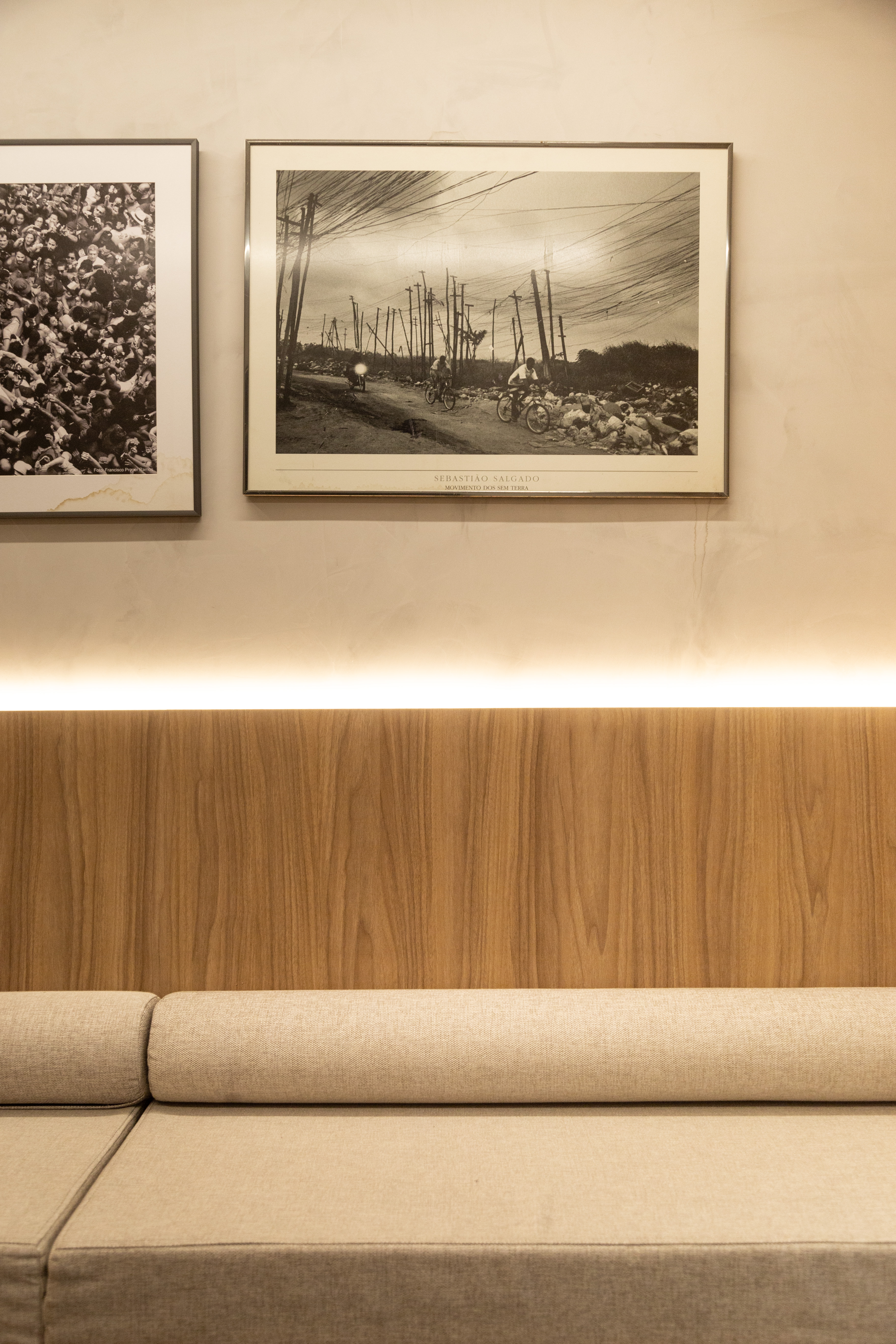Recepção de escritório de advocacia com painéis amadeirados, estofados em linho, e diversas possibilidades de iluminação que trazem aconchego ao espaço. Formas curvas dão charme e leveza ao ambiente.