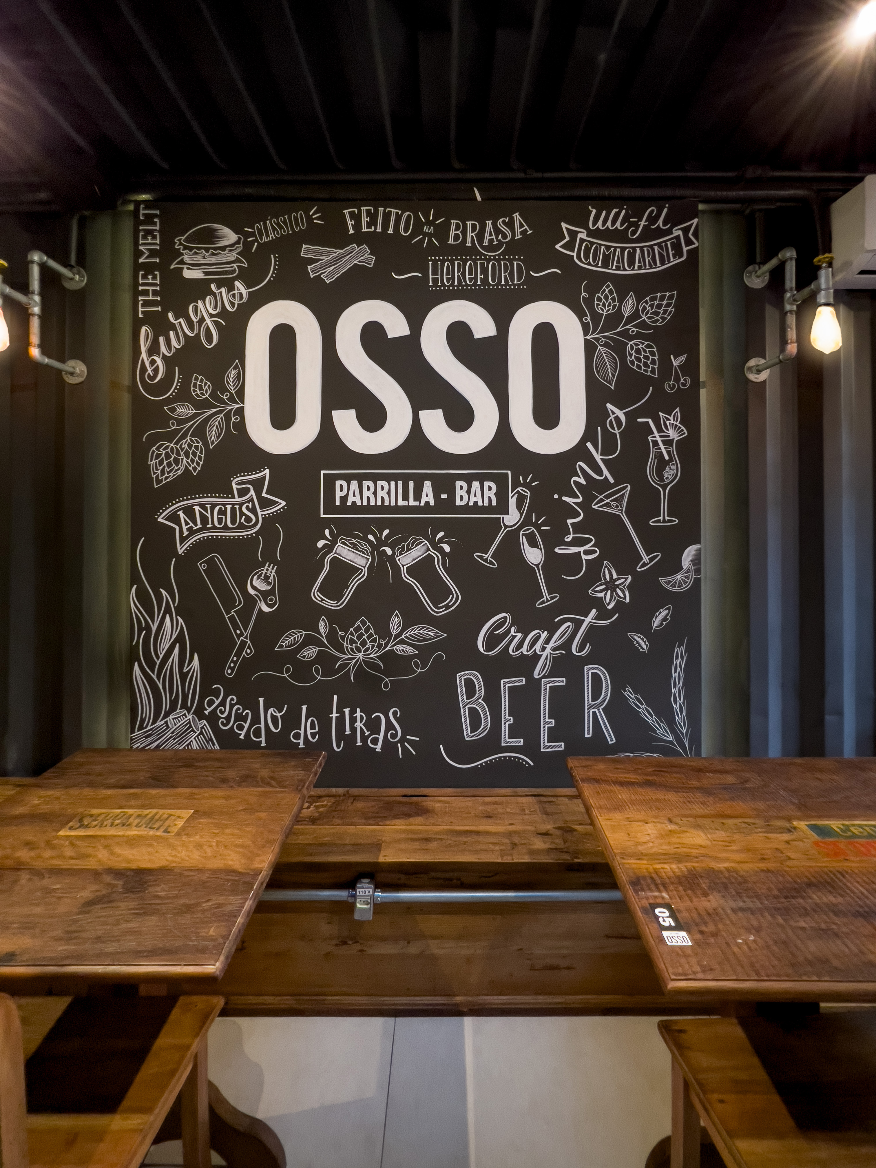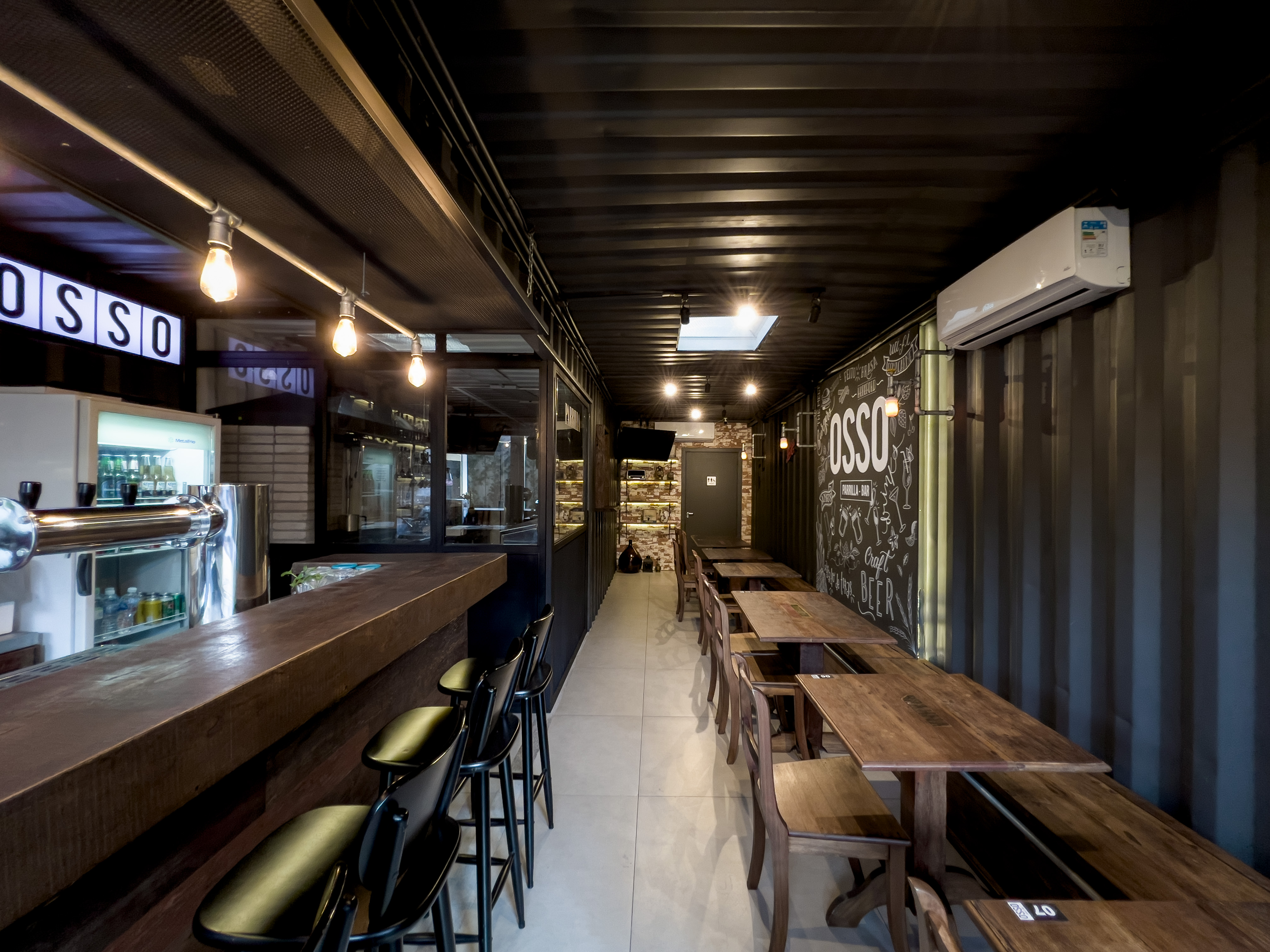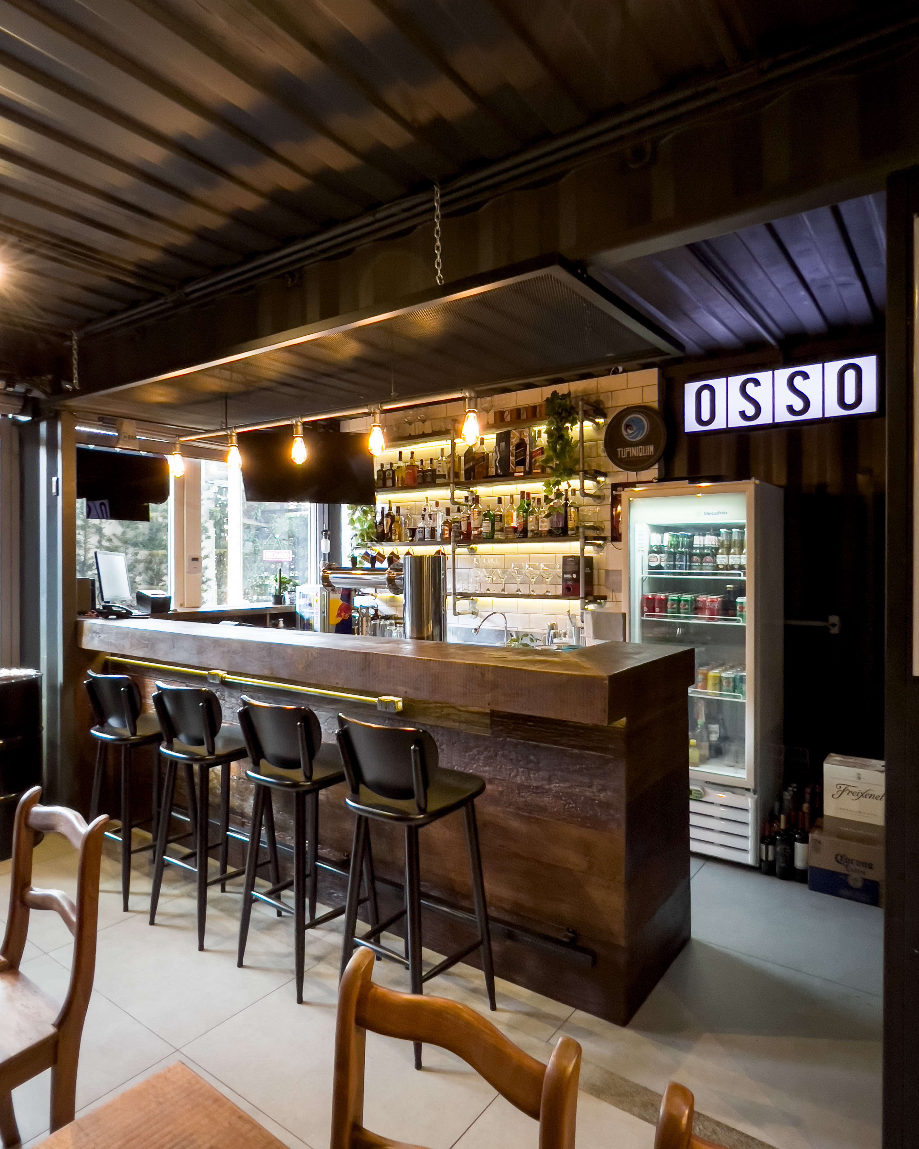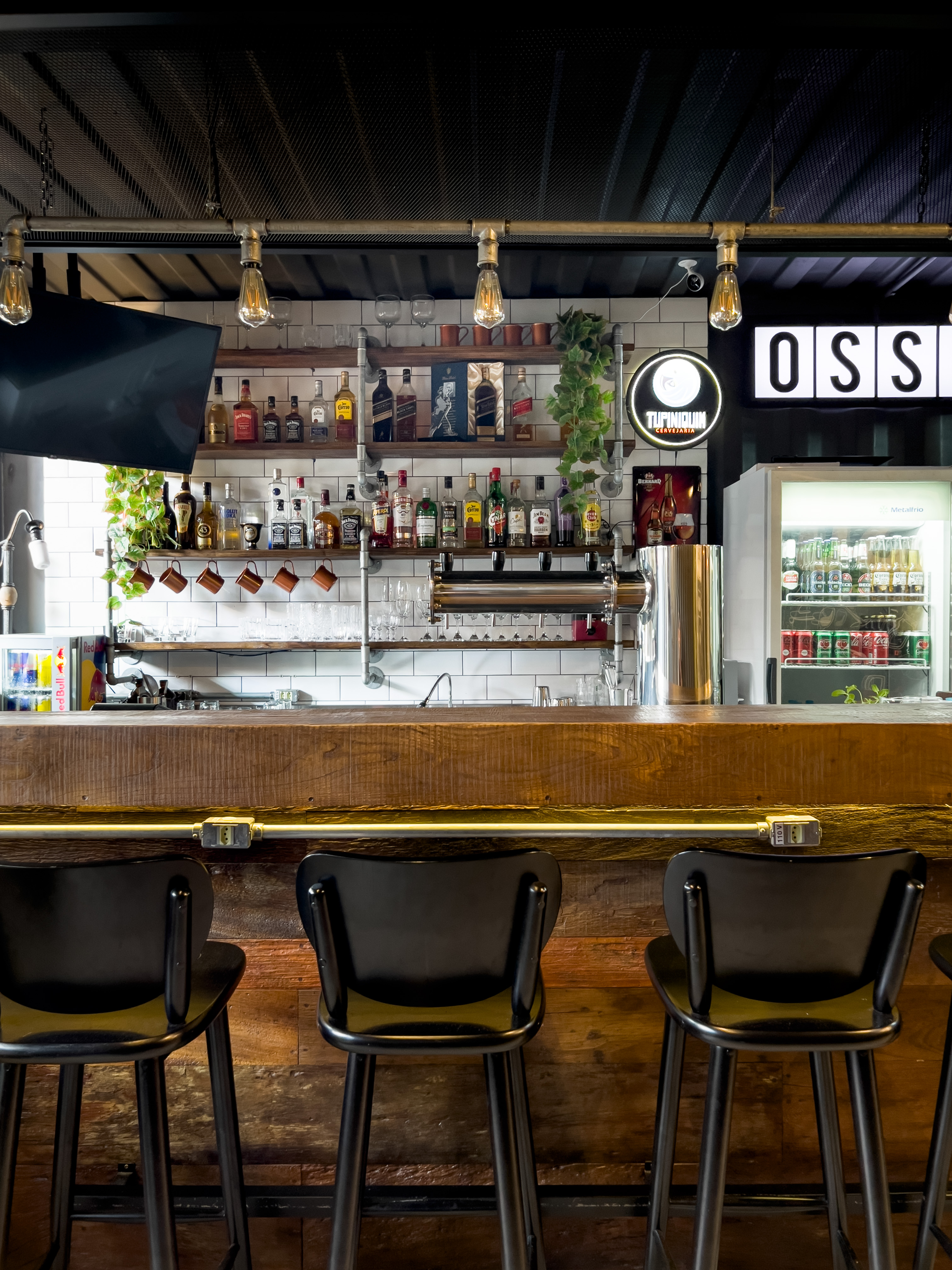 Bar que traz o mesmo conceito do restante das franquias: muito preto, tubulações aparentes, tijolos de demolição, iluminação acolhedora, canos como luminárias, madeira de demolição e parrilha à vista.