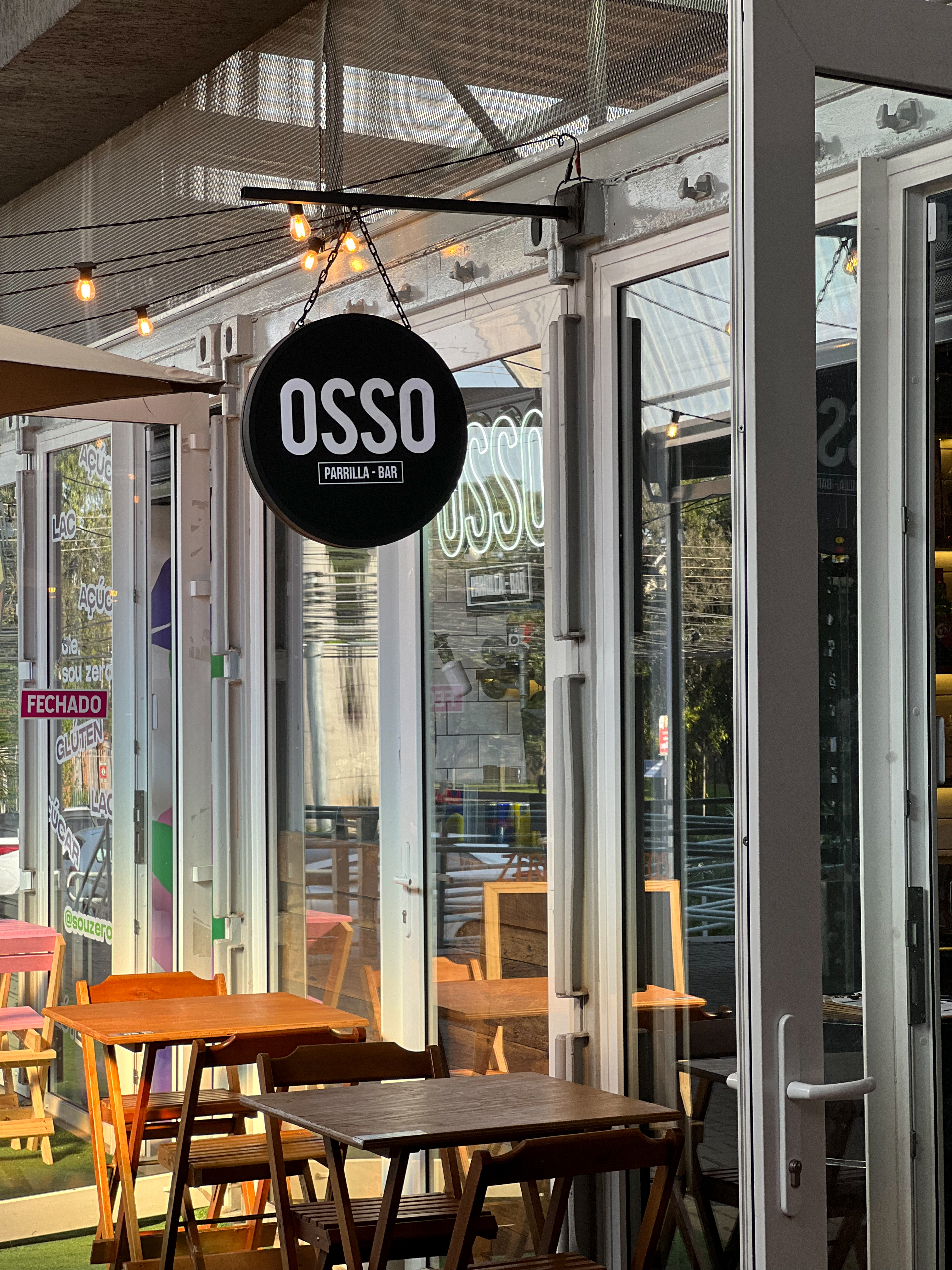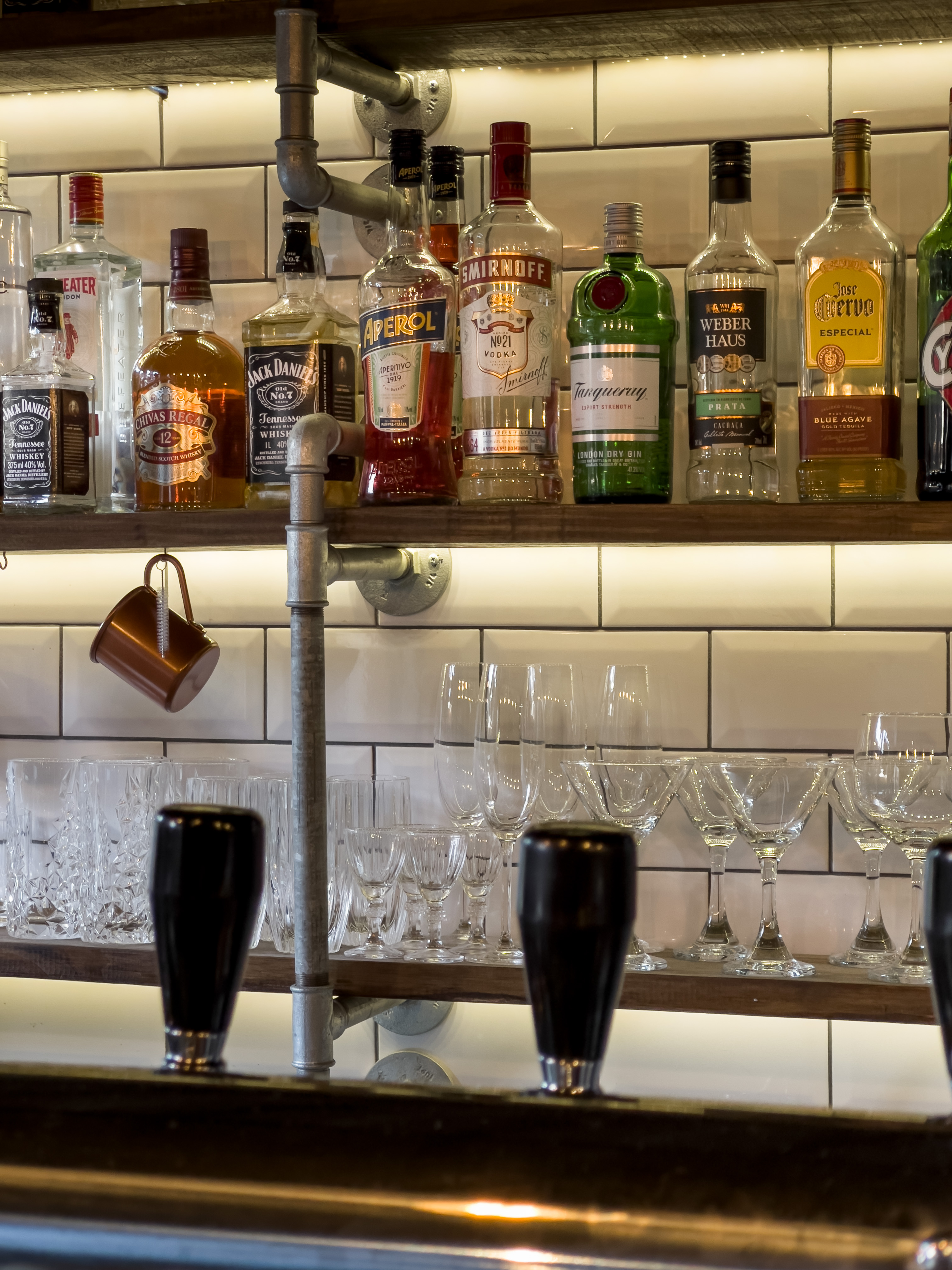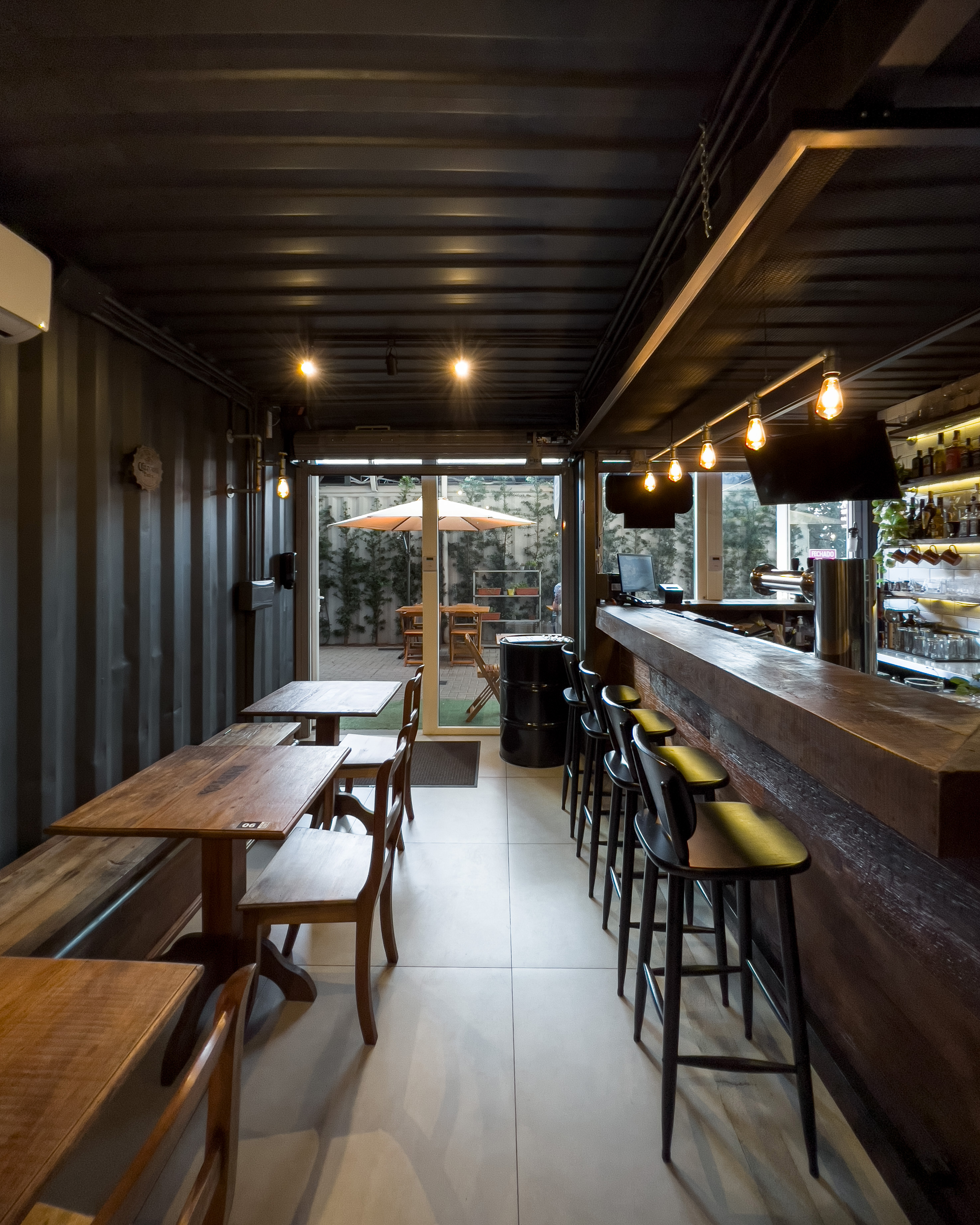 Bar que traz o mesmo conceito do restante das franquias: muito preto, tubulações aparentes, tijolos de demolição, iluminação acolhedora, canos como luminárias, madeira de demolição e parrilha à vista.