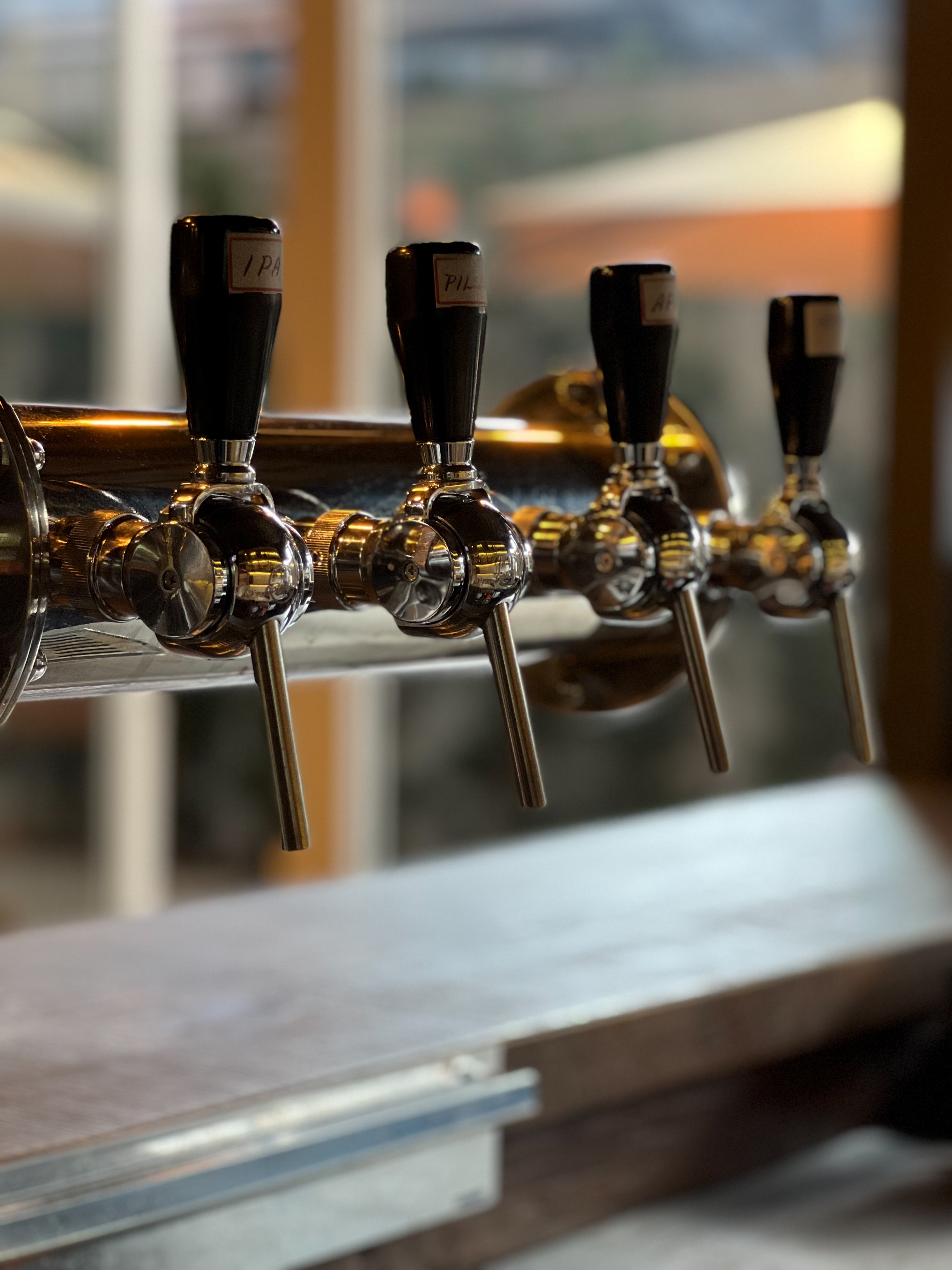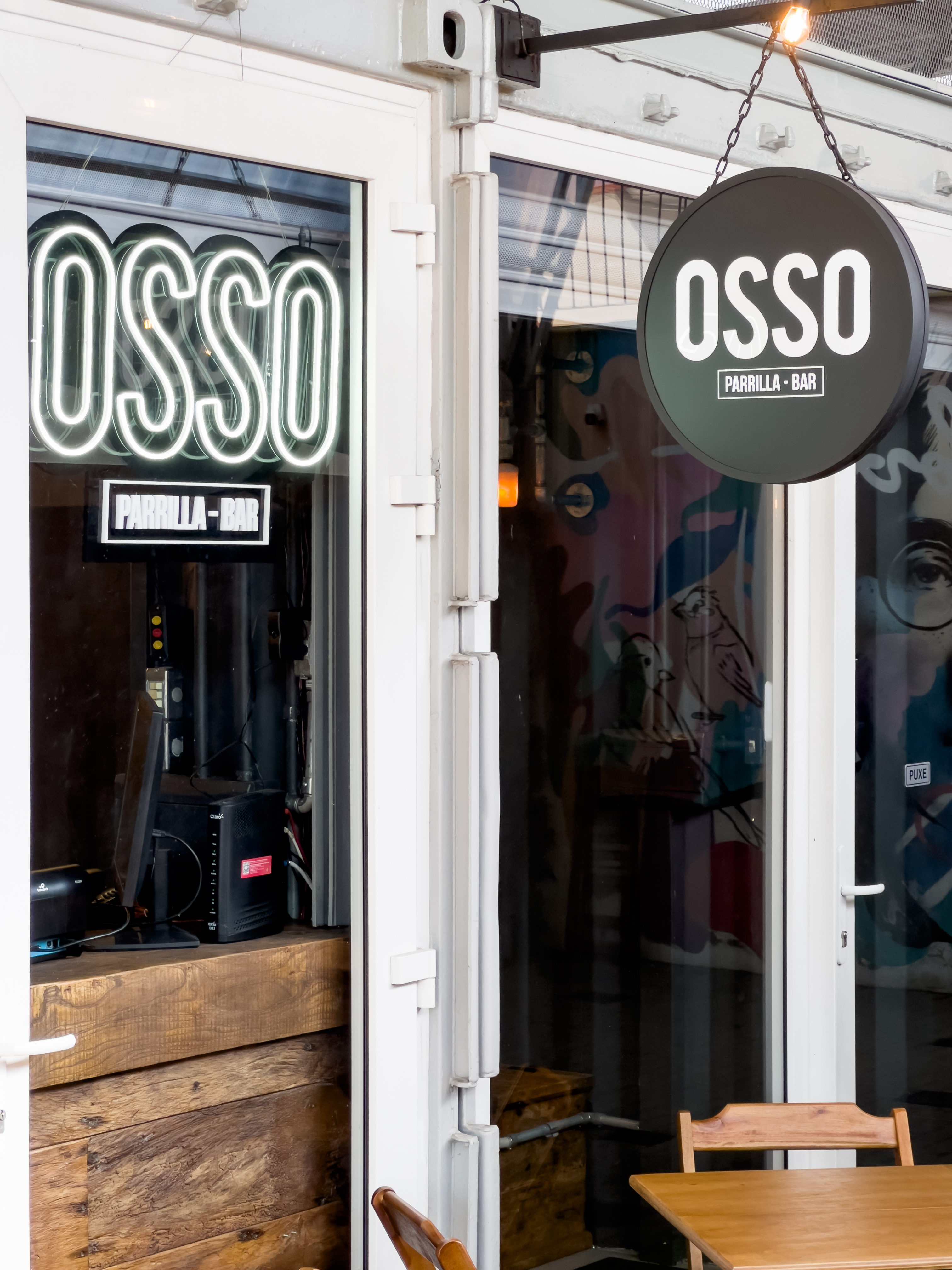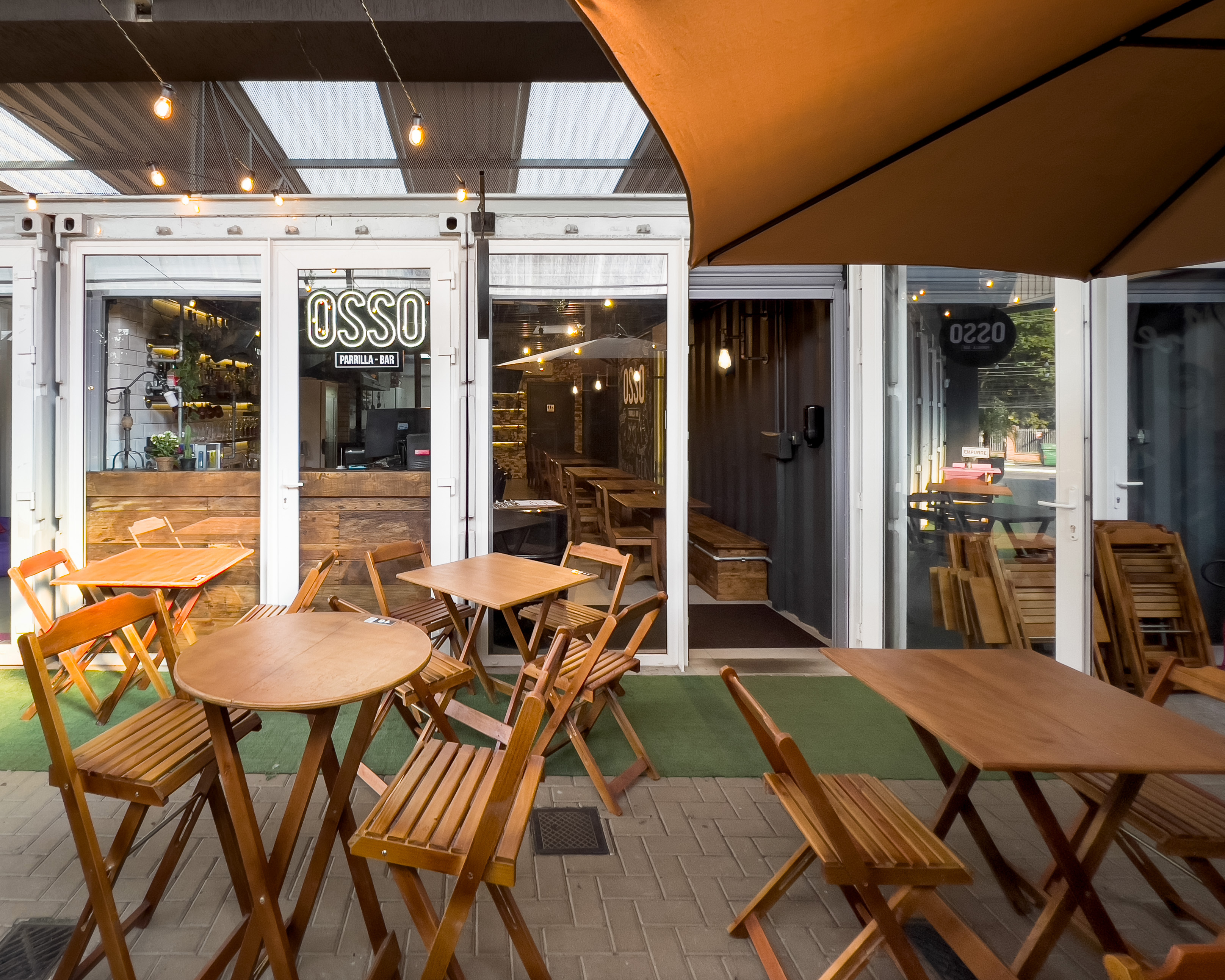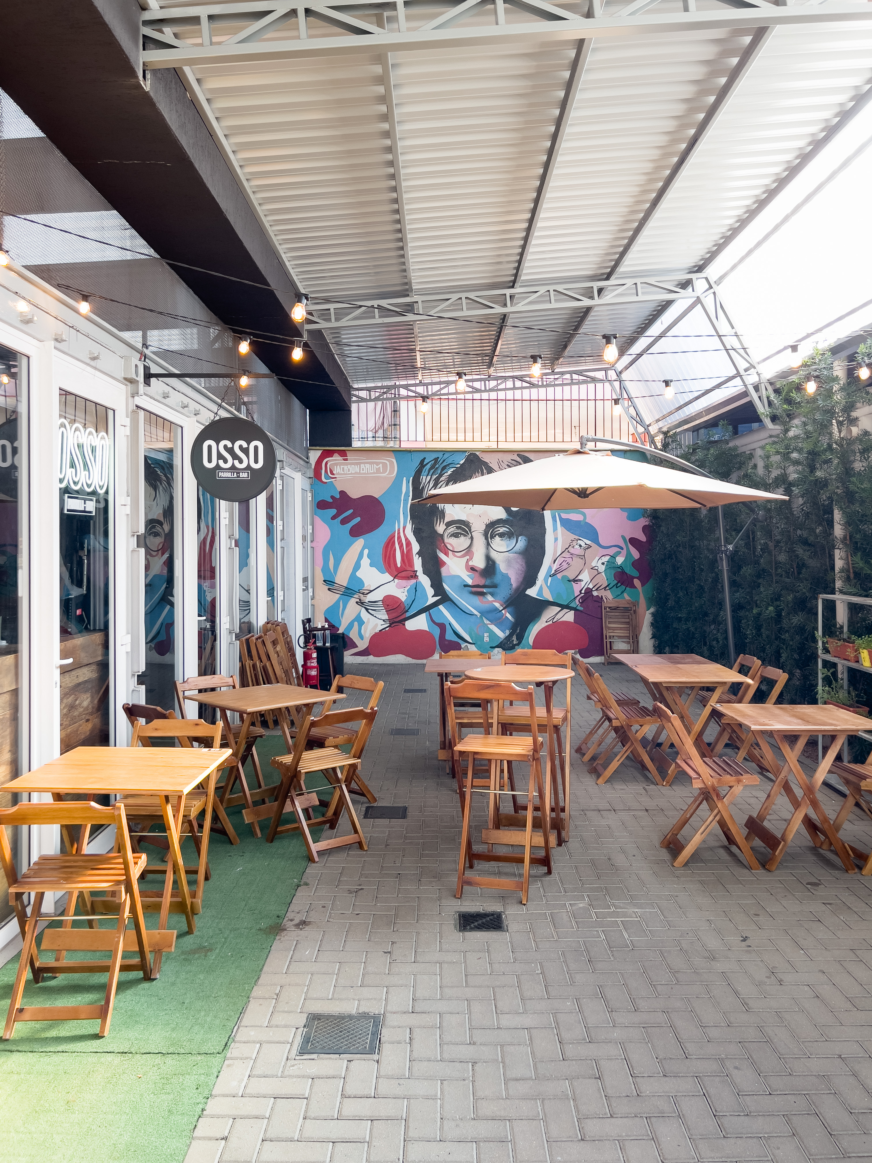 Bar que traz o mesmo conceito do restante das franquias: muito preto, tubulações aparentes, tijolos de demolição, iluminação acolhedora, canos como luminárias, madeira de demolição e parrilha à vista.
